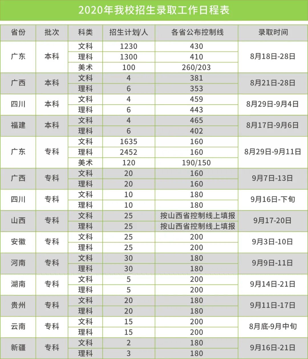 广科大2020年各省招生录取工作日程