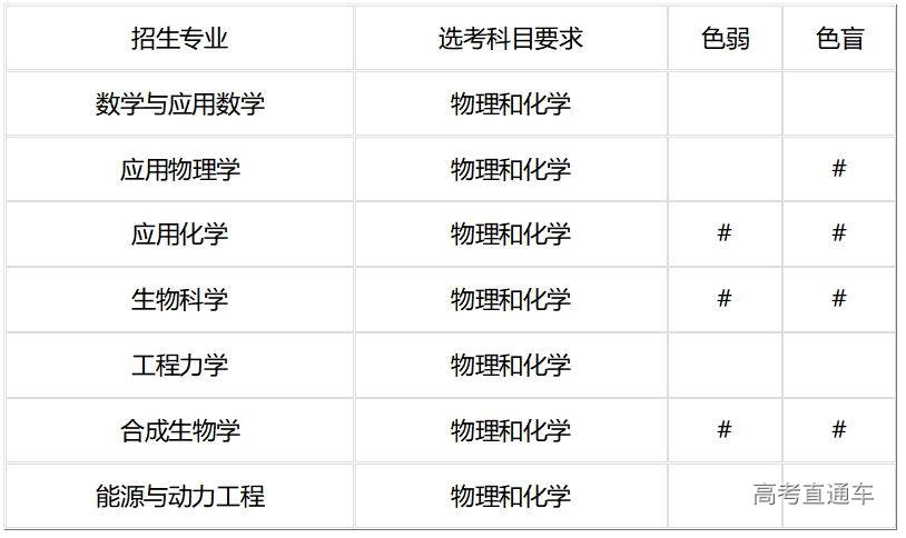 我校招生专业包括数学与应用数学、应用物理学、应用化学、生物科学、工程力学、合成生物学、能源与动力工程。所有招生专业在非高考改革省份招收理科考生,在高考改革省份选考科目要求见下表: