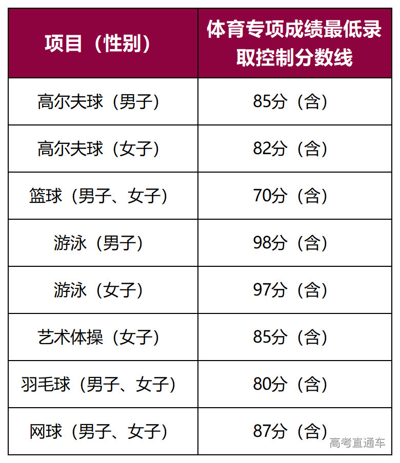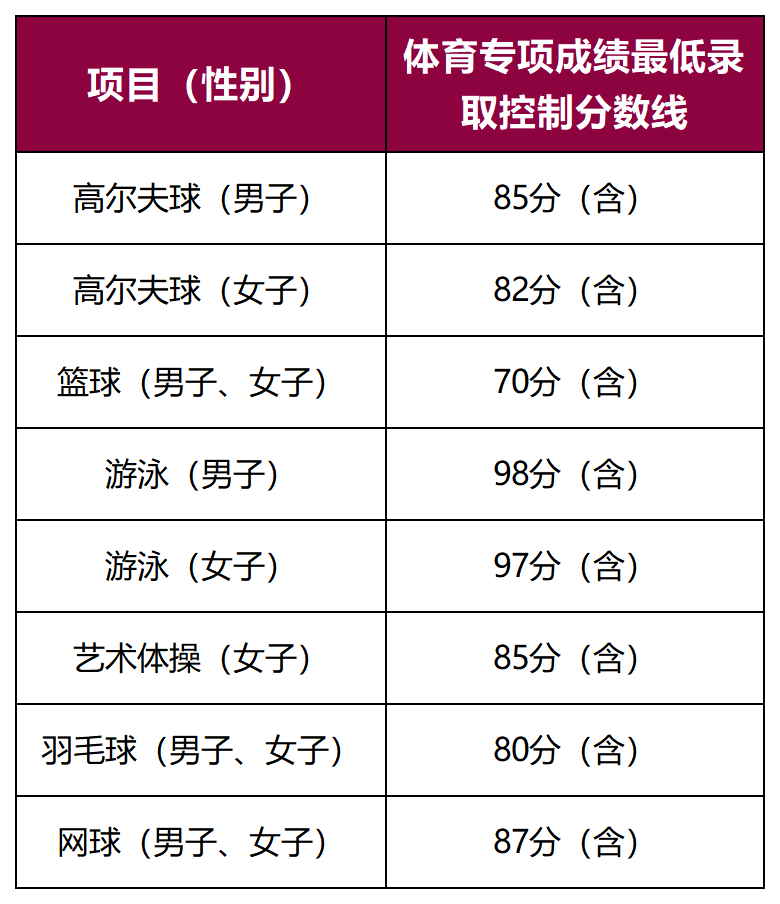 拟录取考生的体育专项考试成绩须达到我校规定的各项目(性别)体育专项成绩最低录取控制分数线及以上(计算时保留小数点后两位,采用四舍五入计数保留法)。