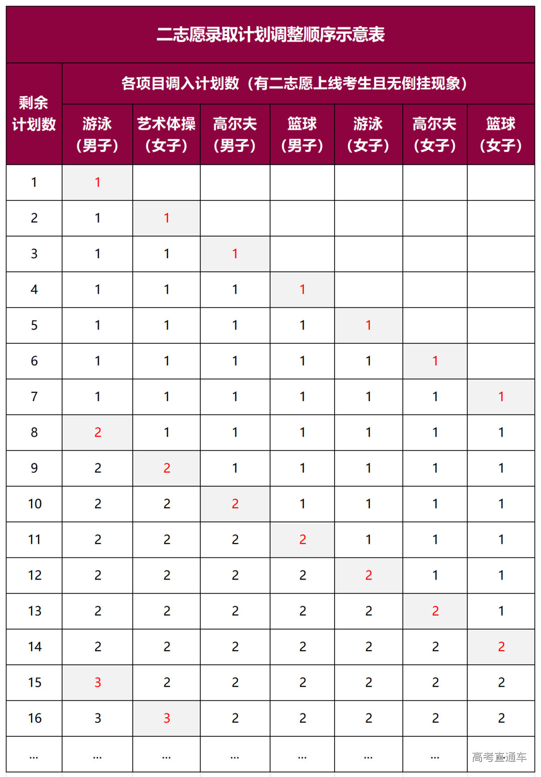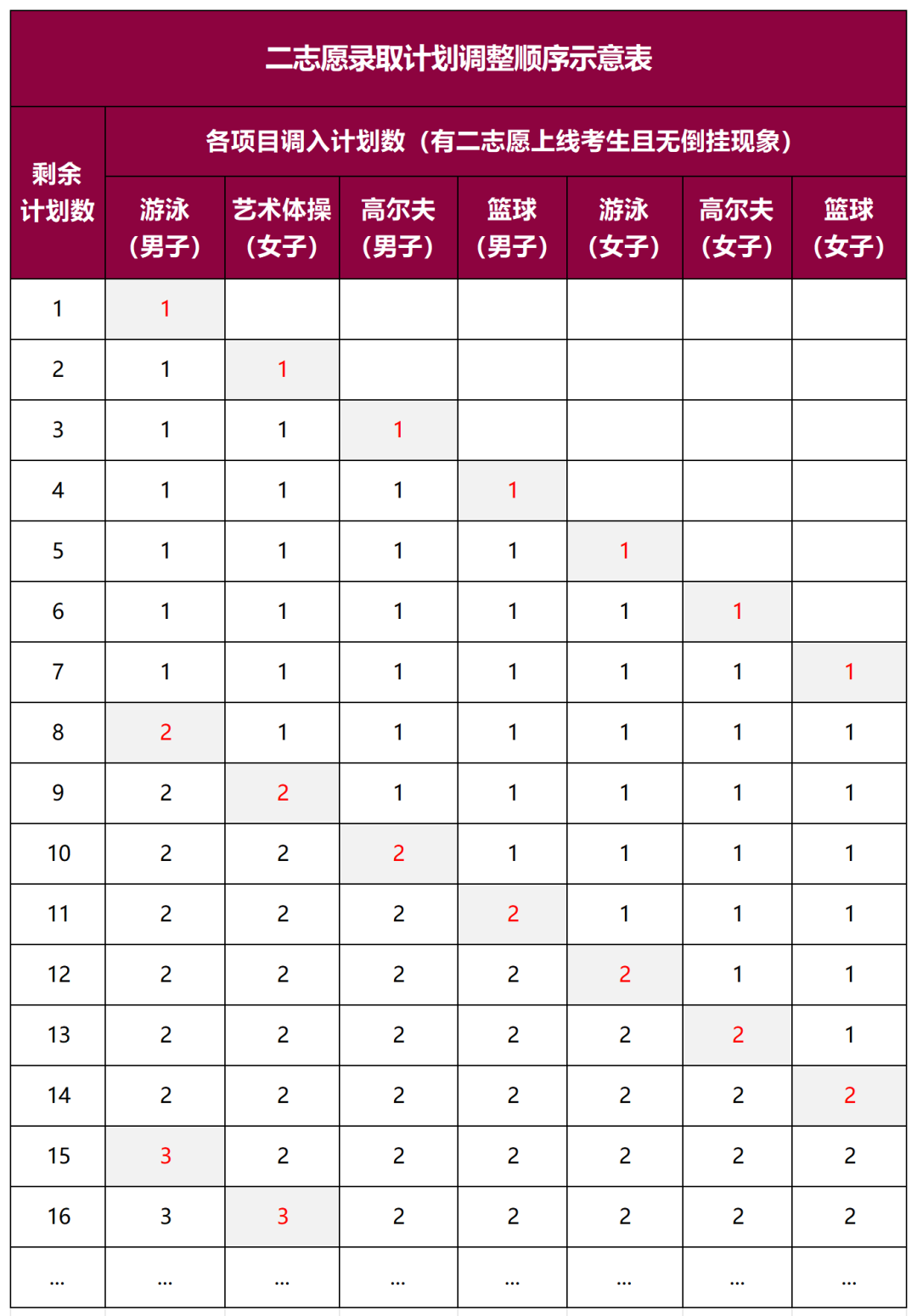 在第二志愿录取期间,如有项目(性别)仍未完成原招生计划,汇总所有项目剩余计划后,依次向第二志愿中仍有未被录取上线考生的优势项目各分配1人,直至剩余计划全部分配完成或优势项目均无未被录取上线考生为止。优势项目次序为:游泳(男子)、艺术体操(女子)、高尔夫(男子)、篮球(男子)、游泳(女子)、高尔夫(女子)、篮球(女子)。