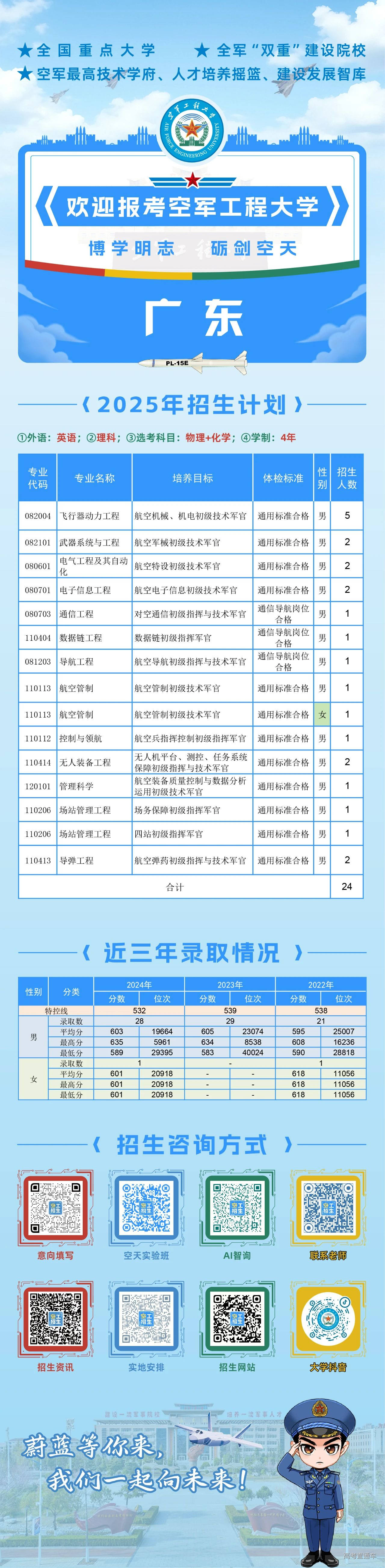 空军工程大学2025年在全国30个省(直辖市、自治区)面向普通高中毕业生招收生长军官本科学员1647人(男生1598人,女生49人),招生规模位居军队院校前列,欢迎广大考生报考!