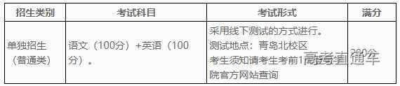 参加单独招生的退役军人类考生不参加文化素质考试与专业技能测试,只进行素质测试。素质测试时间为2023年2月27日,采用线下测试的方式进行,测试地点:青岛北校区,测试内容:素质测试(200分),考生须知请考生考前1周登录学院官方网站查询。