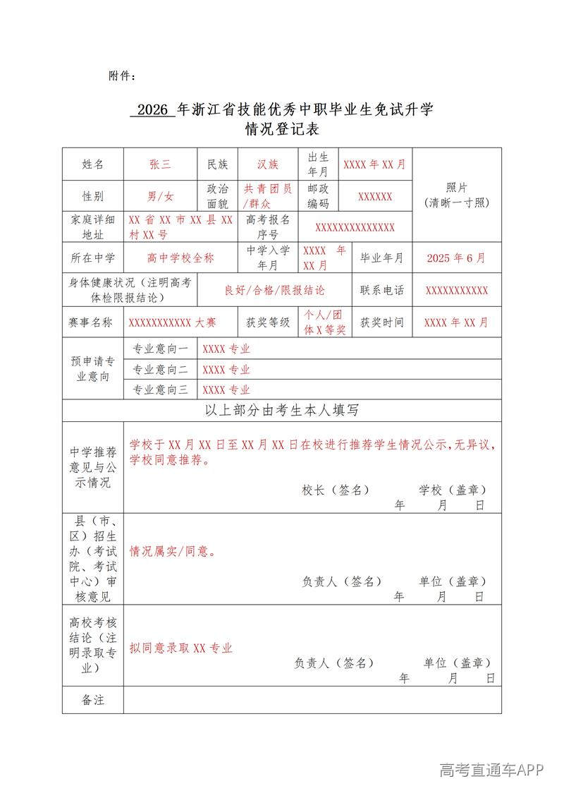 附件1:2026年浙江省技能优秀中职毕业生免试升学情况登记表