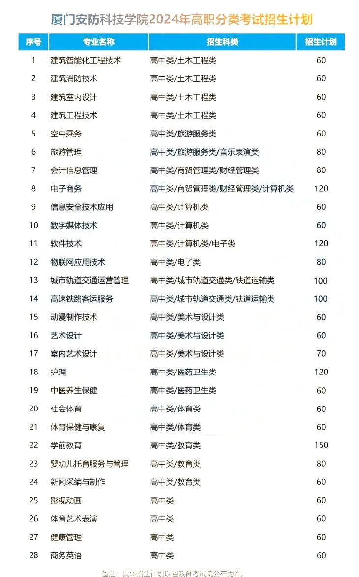 厦门安防科技职业学院2024年高职分类招生计划