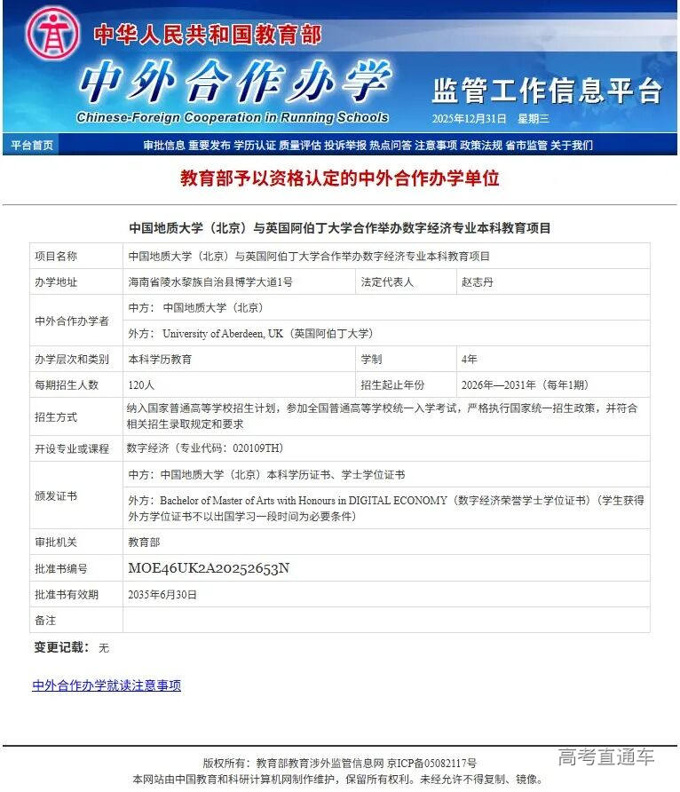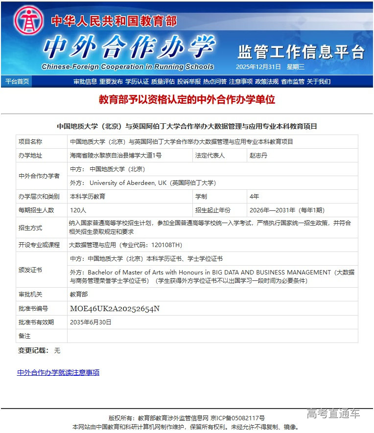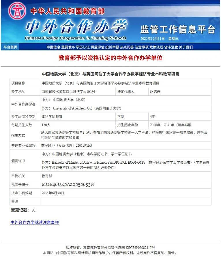 2025年12月31日,经济管理学院与英国阿伯丁大学商学院在海南陵水合作的2个国际合作办学项目“数字经济”“大数据管理与应用”正式获得教育部批准。这一重要成果标志着我院在国际化办学进程中取得重要突破,为培养具有国际视野的高层次经管人才奠定了坚实基础。
