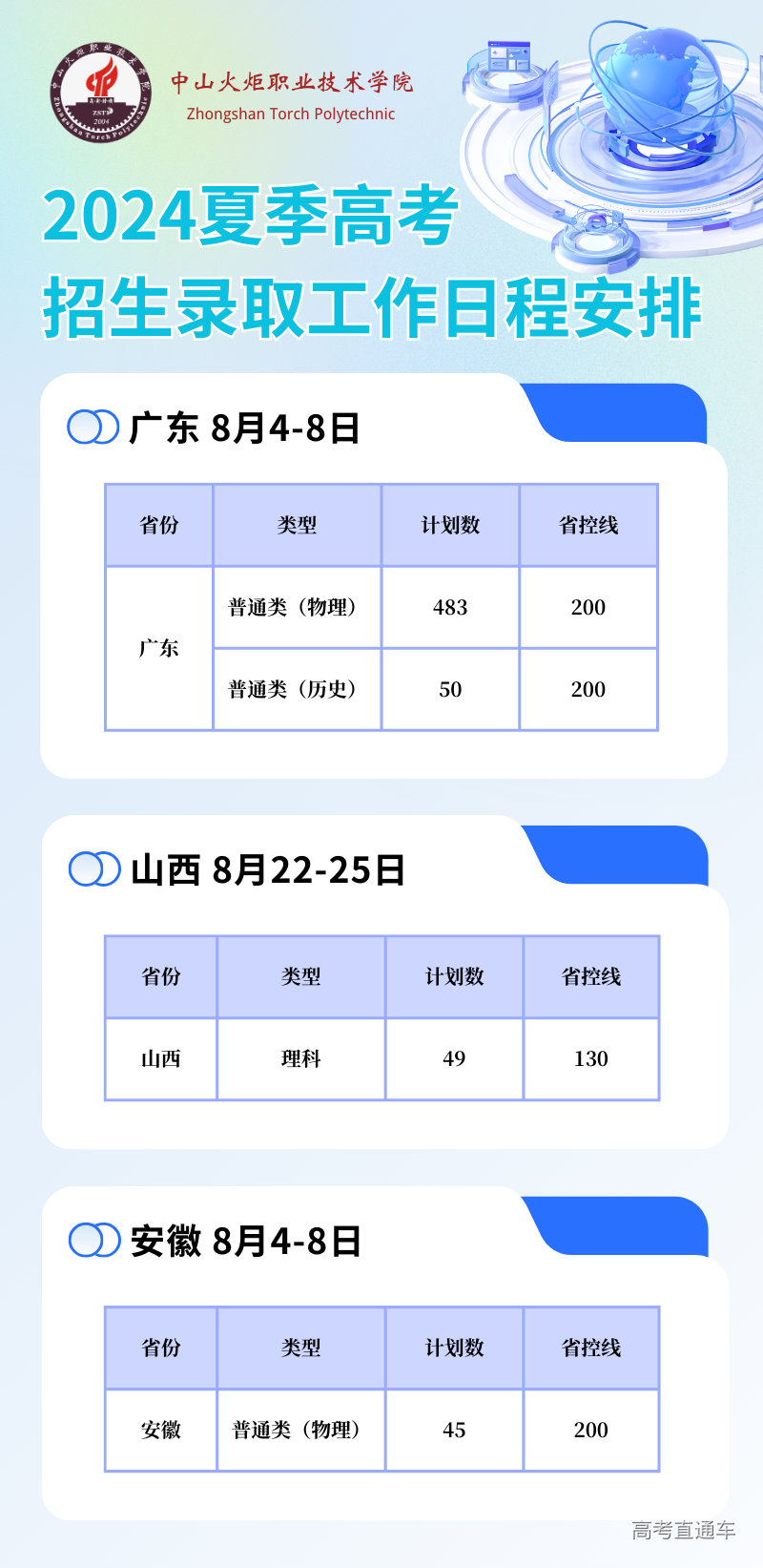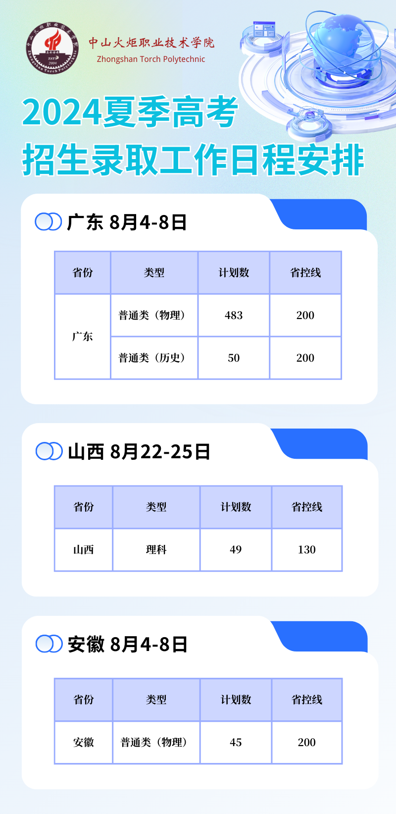 亲爱的2024届高考生们 录取揭幕即将来临 为了让大家更好地了解 中山火炬职业技术学院 2024年各省各批次的招生录取工作日程安排 下划推文 这里为你整理了相关信息 快来看看吧! 2024年,我校在全国10个省(市、区)招生,夏季高考招生计划共1219人,计划类型分为普通类、艺术类。 具体招生安排详见下表: 2024的金秋时节 我们期待你的到来