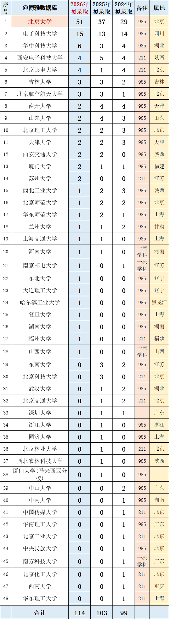 其中,电子学院拟录取推免生114人。较上年增加11人。其中硕士推免生29人,直博生85人。生源高校28所。其中,拟录取北京大学本校2026届推免生51人。