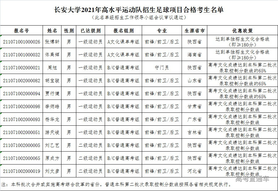 长安大学2021年高水平运动队招生足球项目合格考生名单