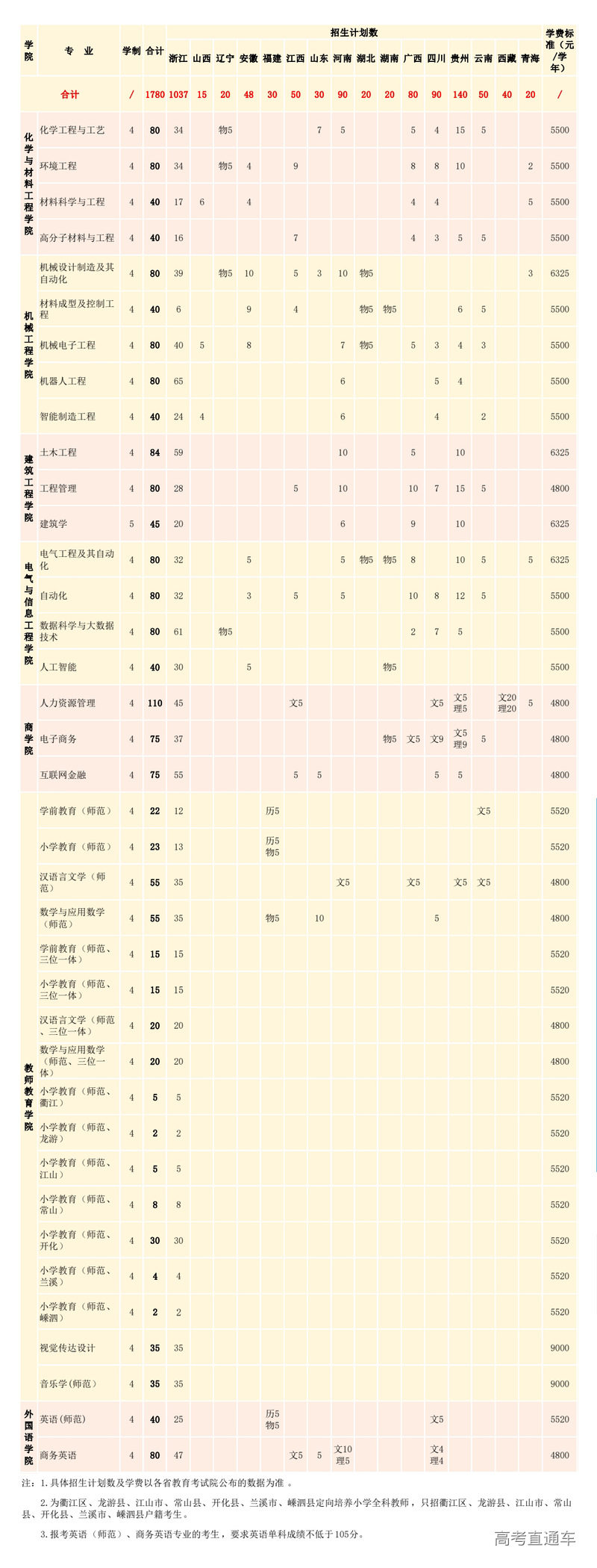 2021年我校共有30个招生专业,其中27个本科专业、3个高职(专科)专业。主要变化包括:1.新增人工智能本科专业招生,暂停物联网工程本科专业招生;2.新增汉语言文学(师范)、数学与应用数学(师范)三位一体招生;3.新增小学教育(师范)专业在衢江、嵊泗的定向招生计划;4.暂停应用化工技术高职专业招生,恢复建筑工程技术高职专业招生。