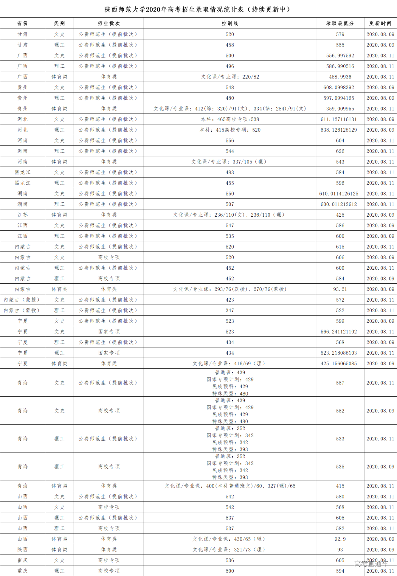陕西师范大学2020年高考招生录取情况统计表(持续更新中)