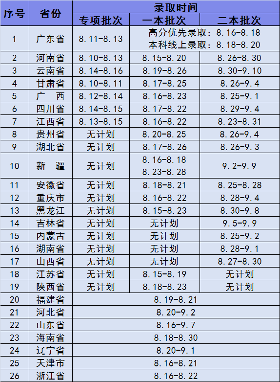 2020年广东医科大学 普高招生录取日程表 文科类、理科类专业分档时,根据各省(区、市)投档规则出档后,实行“分数优先”的录取原则,根据考生投档总分排位情况从高到低排序录取,先安排排位高的考生的第一专业志愿,若该专业额满,再逐一查看该生的后续专业志愿。考生投档总分排位相同时,优先录取已修习相关专业基础知识(模块)的考生。无排位或排位分的省份按照普通高考单科顺序及分数从高到低排序:文科类为语文、数学、外语、文科综合;理科类为数学、语文、外语、理科综合。 我校订单定向培养农村卫生人才专项计划实行“专业志愿优先”原则,根据考生所填报专业志愿按考生投档总分排位情况从高分到低分录取。考生投档总分排位相同时,优先录取已修习相关专业基础知识(模块)的考生。 在内蒙古自治区录取原则单列,实行“招生计划1:1范围内按专业志愿排队录取”的原则。 届时我校将第一时间公布录取结果,关注我校本科招生网、招生办公室官方微信,了解最新录取进程,可通过以下两种方式查询录取结果。 01 手机端 步骤一 关注"广东医科大学招生办公室"微信公众号 步骤二 回复考生身份证号码 步骤三 查看录取结果 02 电脑端 登录广东医科大学本科招生网 "http://zs.gdmu.edu.cn/" 输入身份证号及考生号进行查询。