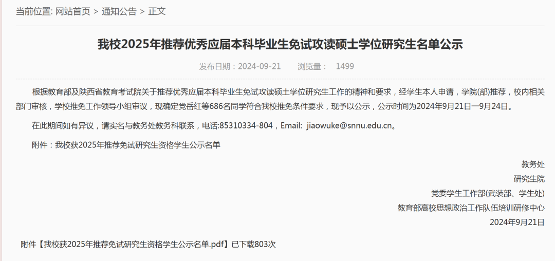 根据 陕西师范大学2025年推荐优秀应届本科毕业生免试攻读硕士学位研究生名单公示,现确定686名同学符合我校推免条件要求。