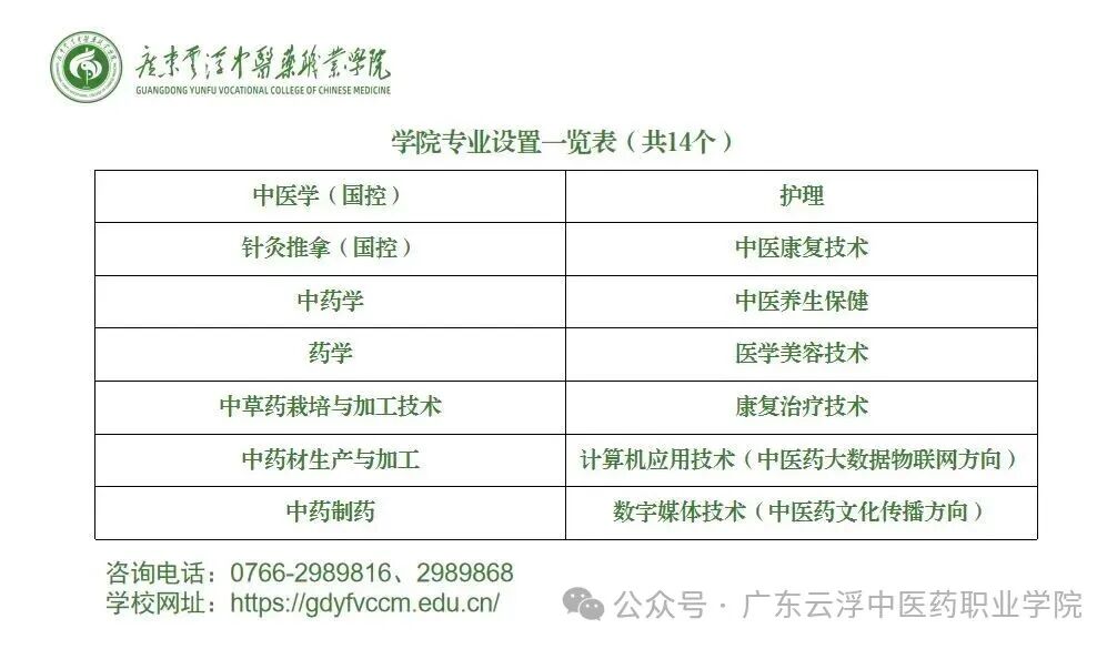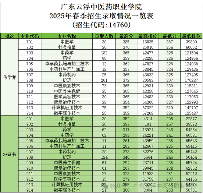 院校国际代码 14760 学费6410元/生·学年,住宿费1500元/生·学年。 广东云浮中医药职业学院2026年 春季高考招生章程 目 录 第一章 总则 第二章 学校概况 第三章 组织机构及职责 第四章 类型及计划公布 第五章 报考要求 第六章 录取办法 第一节 “依学考录取”录取规则 第二节 “3+证书”考试招生录取规则 第三节 录取备案 第七章 录取体检标准 第八章 组织保障 第九章 新生注册和复查 第十章 收费标准 第十一章 资助政策 第十二章 招生咨询、监督与申诉 第十三章 附则 第一章 总则 第一条 为进一步规范学校春季高考招生录取工作,维护学校和考生合法权益,根据《中华人民共和国教育法》《中华人民共和国高等教育法》以及教育部、广东省招生委员会有关规定,结合学校实际,特制定本章程。 第二条学校招生工作遵循“公平竞争、公正选拔、公开程序,德智体美劳全面考核、综合评价、择优录取”的原则,并接受纪检监察部门、考生、家长以及社会各界的监督。 第二章 学校概况 第三条 院校名称:广东云浮中医药职业学院 第四条 院校国标代码:14760 第五条 学校地址:校本部:广东省云浮市新兴县教育园区;邮政编码:527400 第六条 办学层次:高职(专科) 第七条 办学性质:公办 第八条 办学类型:全日制 第九条 学校主管单位:云浮市人民政府 学校业务主管单位:广东省教育厅 第十条 毕(结)业颁证:按国家招生管理规定录取并取得本校正式学籍的学生,在校期间完成教学计划规定的理论和实践教学环节,成绩合格,获得规定的学分,达到毕(结)业要求者,颁发相应普通高等学校毕(结)业证书。颁发证书学校名称:广东云浮中医药职业学院,证书种类:普通高等学校毕(结)业证书。退学者,视具体情况发放肄业证书或写实性学习证明。 第三章 组织机构及职责 第十一条 学校招生委员会负责制定招生章程、招生计划、招生办法并组织实施,建立监督协调机制,处理春季高考招生工作中的重大事项。 第十二条 广东云浮中医药职业学院招生工作办公室为招生委员会的执行机构,负责招生日常事务工作。 第十三条 学校设立由校领导和纪检监察部门组成的招生监督小组,对招生工作实施监督。录取期间成立信访组,安排专人负责处理考生及家长的申诉、投诉等信访事项。 第四章 类型及计划公布 第十四条 本校春季高考招生含“依据普通高中学业水平考试成绩”招生录取(下称“依学考录取”)、招收中等职业学校毕业生统一考试招生录取(下称“3+证书”考试招生)等,具体分专业招生计划及要求以广东省招生办公室编制的《广东省2026年普通高校春季高考统一招生专业目录》为准。 第五章 报考要求 第十五条 报考本校“依学考录取”的考生须符合广东省招生委员会《关于做好广东省2026年高职院校依据普通高中学业水平考试成绩招生录取工作的通知》(粤招办普〔2025〕45号)规定的有关普通高考报名条件,并参加广东省2026年普通高考报名及2026年1月广东省普通高中学业水平合格性考试语文、数学、英语3门科目考试。 本校“依学考录取”各招生专业有关要求详见《广东省2026年普通高校春季高考统一招生专业目录》(高中生版)。 第十六条 报考本校“3+证书”考试招生的中职考生须符合广东省招生委员会《关于做好广东省2026年普通高校招收中等职业学校毕业生统一考试招生工作的通知》(粤招办普〔2025〕44号)规定的有关普通高考报名条件,并参加广东省2026年普通高考报名及广东省2026年普通高等学校招收中等职业学校毕业生统一考试且取得拟报考专业要求的专业技能证书。 本校“3+证书”考试各招生专业有关要求详见《广东省2026年普通高校春季高考统一招生专业目录》(中职生版)。 第六章 录取办法 第十七条 按照“学校负责,省招办监督”的原则,本着公平、公正、公开,以考生相应成绩为基本依据,综合衡量德智体美劳,制定“依学考录取”“3+证书”考试招生录取规则。 第十八条 本校公共外语教学为英语,请非英语语种考生慎重报考。 第一节 “依学考录取”录取规则 第十九条 本校“依学考录取”按普通类进行录取,普通类根据考生投档学考成绩总分排位情况从高到低择优录取。在考生符合专业要求的基础上,采取“分数优先”的原则,优先录取投档总分排在前面的考生,再录取投档总分排在后面的考生。当考生投档(合成)总分相同时,按照考生排位择优录取,当考生排位相同时,参考综合素质评价择优录取。 第二节 “3+证书”考试招生录取规则 第二十条 本校“3+证书”考试招生根据考生统一文化科目考试投档总分排位情况从高到低择优录取。按照“分数优先”的原则,优先录取投档总分排位在前面的考生,再录取投档总分排位在后的考生。 当考生投档总分相同时,按照考生排位择优录取。当考生排位相同时,优先录取中职阶段就读专业相关性较高的考生。 第三节录取备案 第二十一条 学校将春季高考拟录取的各专业考生名单报省招生办公室审核备案,并根据省招生办公室审核通过的名单发放录取通知书。 第七章 录取体检标准 第二十二条 学校录取考生的体检标准按照教育部、卫生部、中国残疾人联合会颁布的《普通高等学校招生体检工作指导意见》(教学〔2003〕3号)和《教育部办公厅 卫生部办公厅关于普通高等学校招生学生入学身体检查取消乙肝
