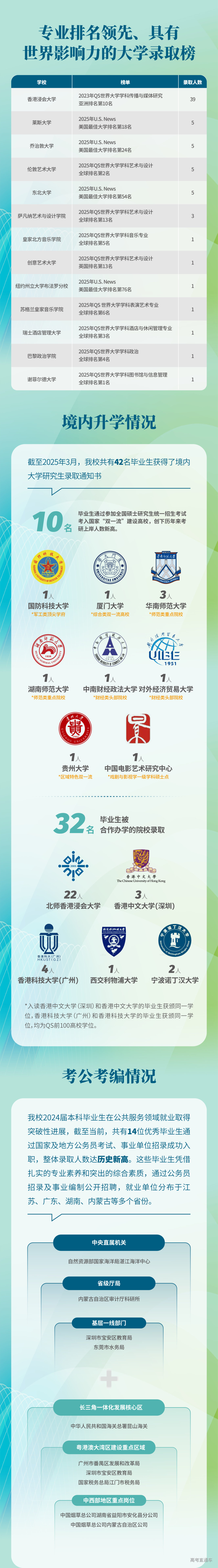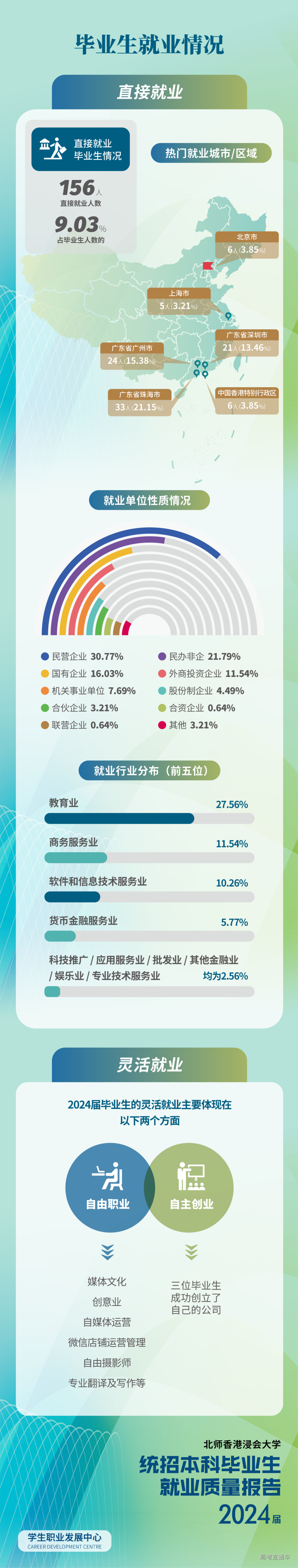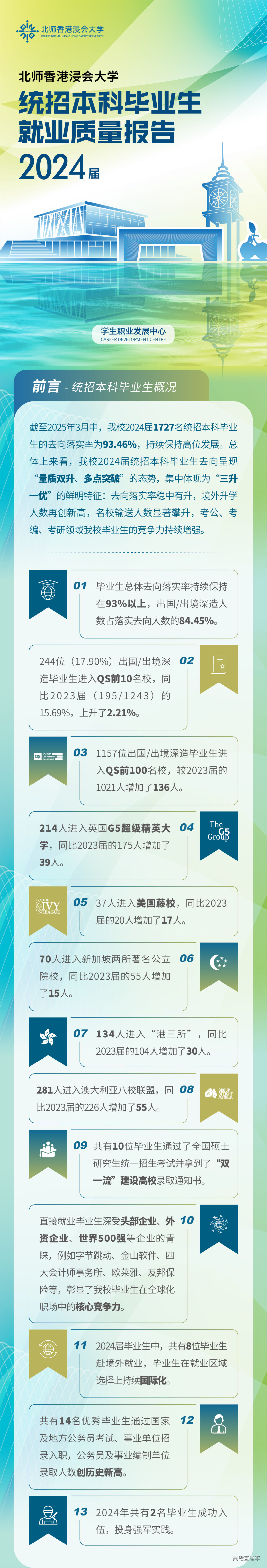 北师香港浸会大学(BNBU)2024届本科毕业生就业质量报告发布。从总体上看,2024届本科毕业生呈现去向落实率稳中有升、境外升学人数再创新高、名校输送率显著攀升等量质齐升的特点。 在落实去向的毕业生中,境内外总升学率为87%;选择出国/出境升学的约占84.5%,其中QS全球百强名校输送率为84.9%,比上一年增长136人;全球十强名校输送率为17.9%,比上一年增长49人。进入英国G5超级精英大学、美国藤校、新加坡两所著名公校、澳大利亚八校联盟的人数均有增长。选择境内升学的毕业生多考入“双一流”建设高校,人数创历史新高。 直接就业的毕业生深受头部企业、外资企业、世界500强等青睐,公务员和事业单位录取人数均创历史新高。