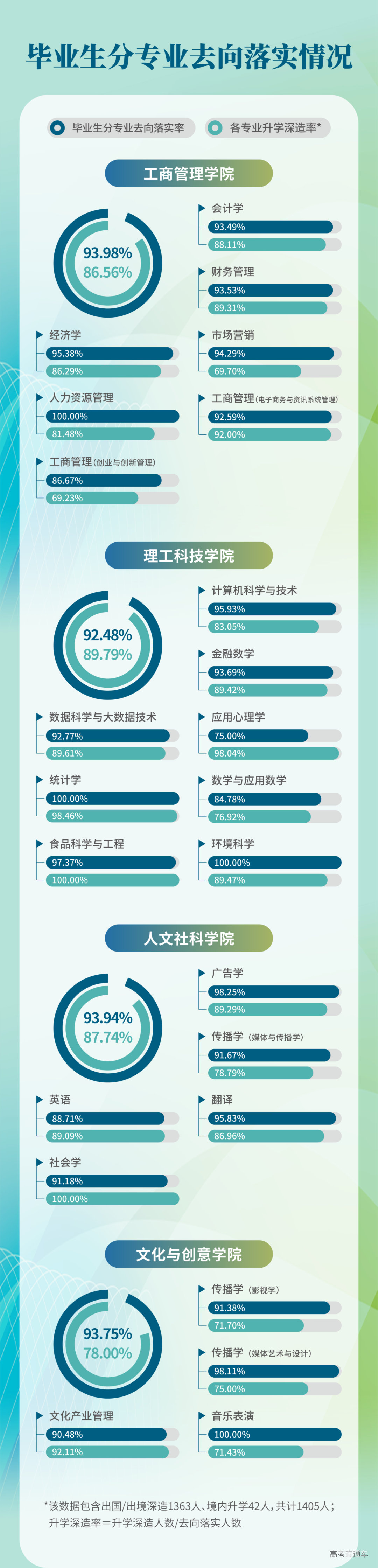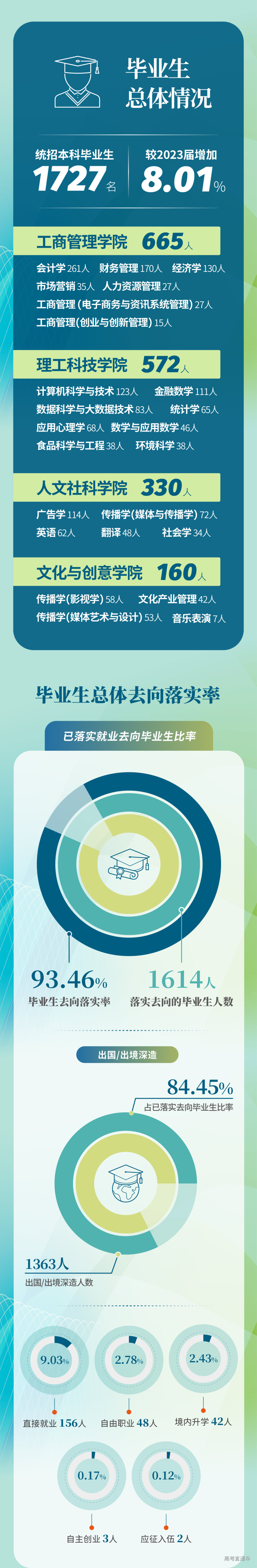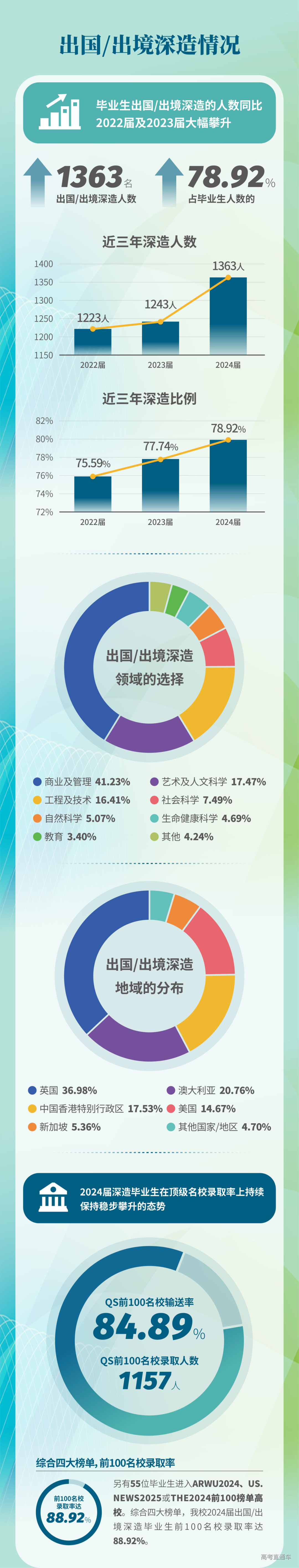 北师香港浸会大学(BNBU)2024届本科毕业生就业质量报告发布。从总体上看,2024届本科毕业生呈现去向落实率稳中有升、境外升学人数再创新高、名校输送率显著攀升等量质齐升的特点。 在落实去向的毕业生中,境内外总升学率为87%;选择出国/出境升学的约占84.5%,其中QS全球百强名校输送率为84.9%,比上一年增长136人;全球十强名校输送率为17.9%,比上一年增长49人。进入英国G5超级精英大学、美国藤校、新加坡两所著名公校、澳大利亚八校联盟的人数均有增长。选择境内升学的毕业生多考入“双一流”建设高校,人数创历史新高。 直接就业的毕业生深受头部企业、外资企业、世界500强等青睐,公务员和事业单位录取人数均创历史新高。