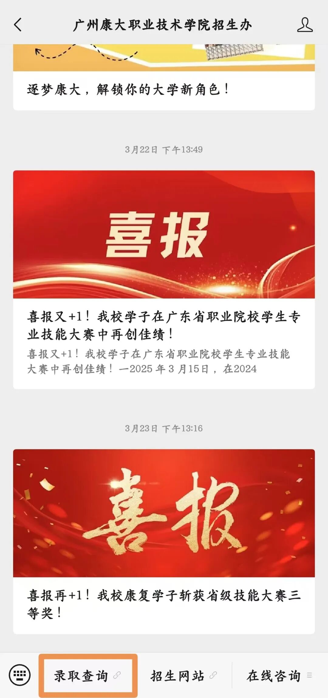一、考生可关注学院招生办官方微信公众号,点击进入公众号,找到下方【录取查询】。