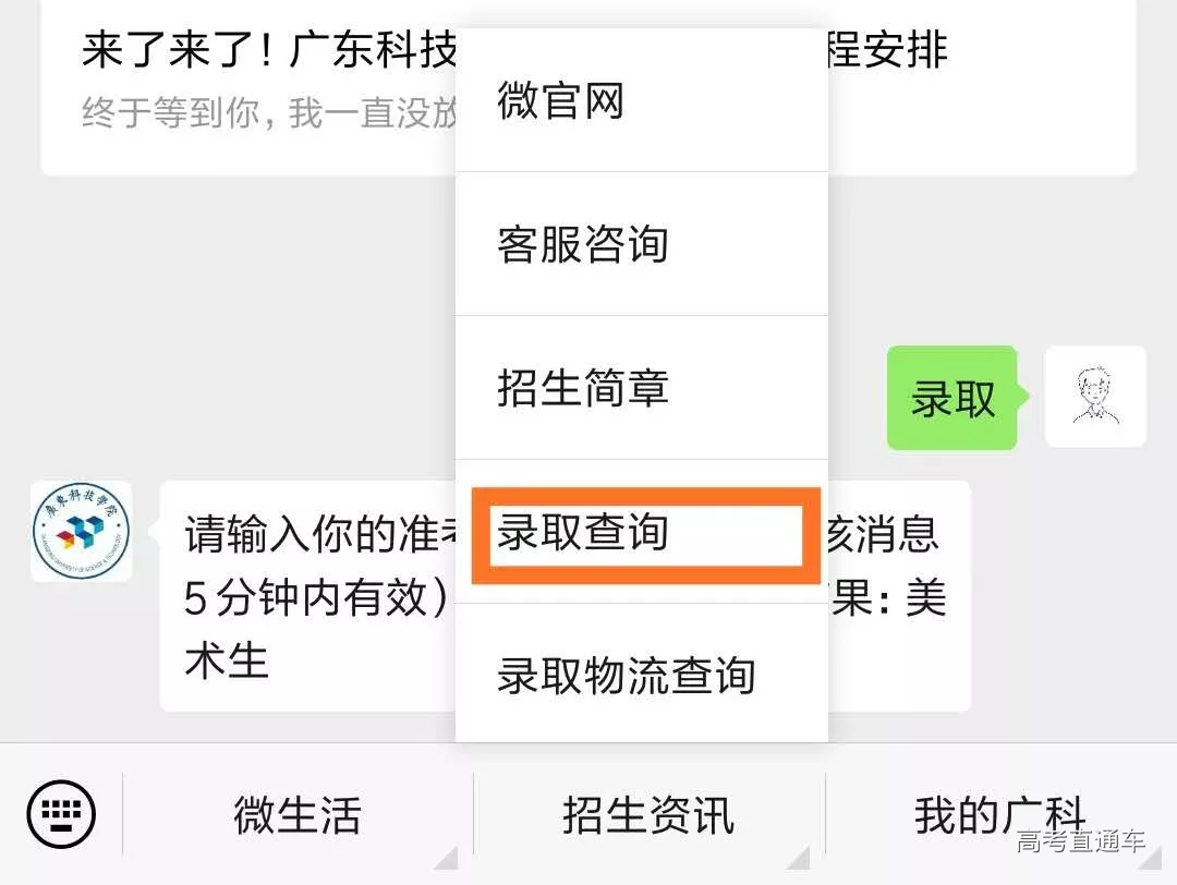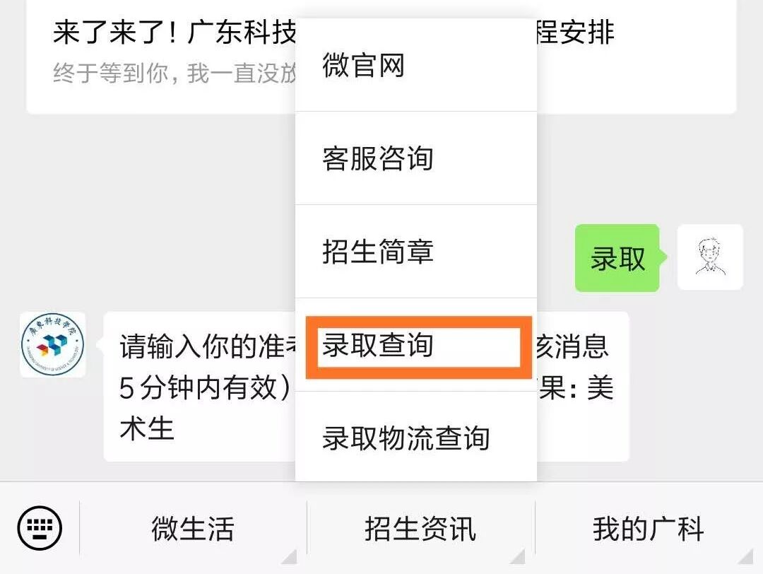 ②在“广东科技学院招生办”微信公众号后台输入“录取”,再输入准考证号码或者身份证号码即可查询。