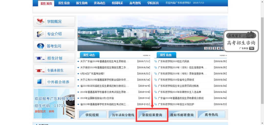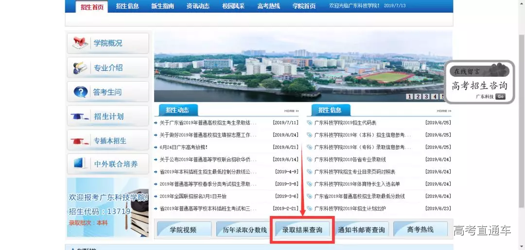 前往广东科技学院招生信息网(zs.gdust.cn),在首页通过“录取结果查询”查询录取结果。