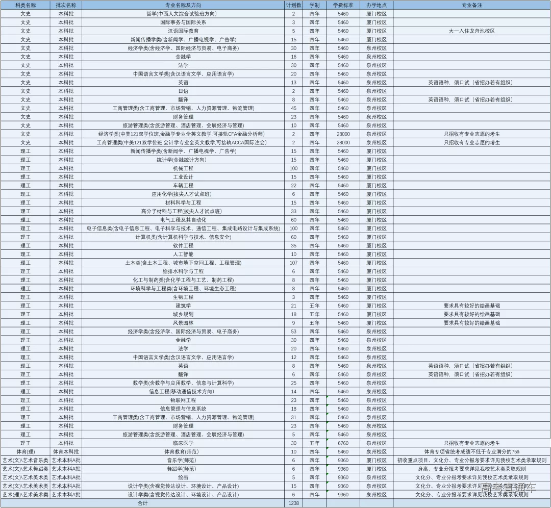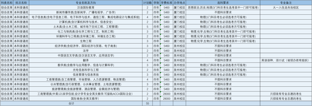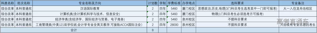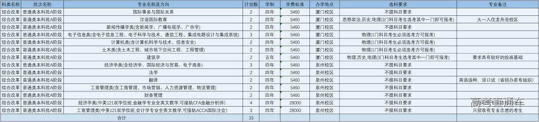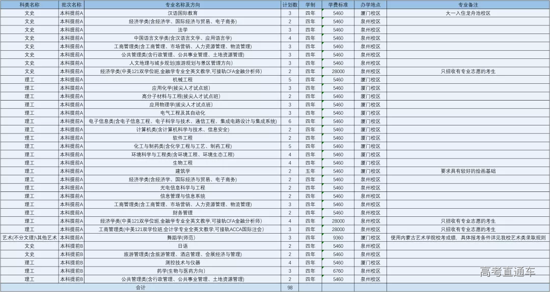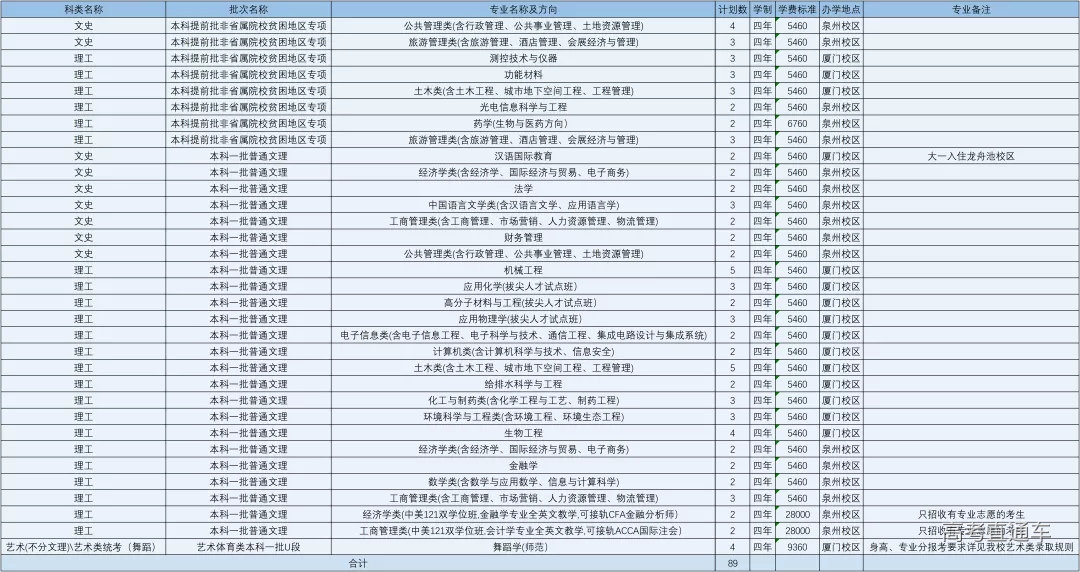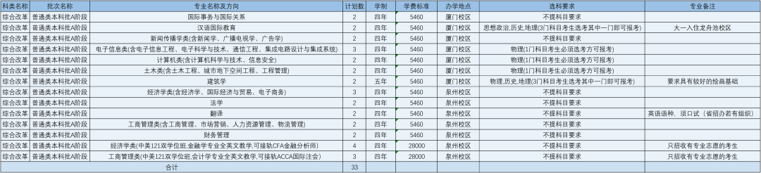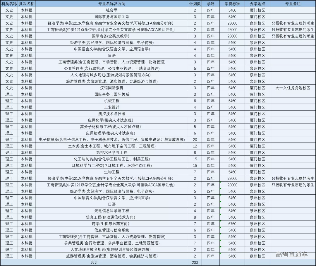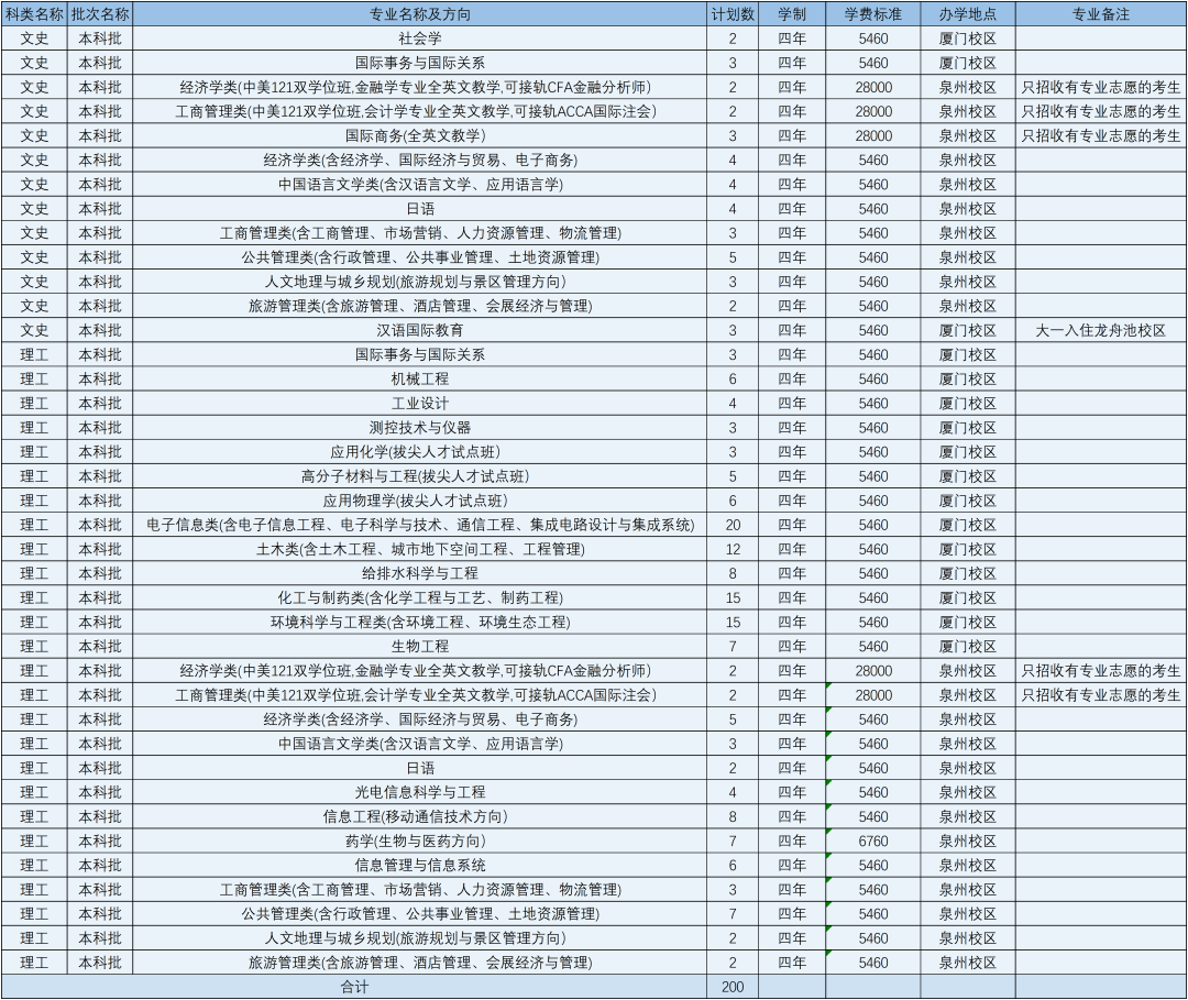 这个九月,我们华大见! 学校性质 直属中央统战部领导 是中央统战部、教育部与福建省共建的综合性大学 福建省“双一流”建设高校 博士学位授权高校 办学地点 厦门校区——福建省厦门市 泉州校区——福建省泉州市 学校排名 2018中国最好大学排名——第86位 2018年中国高校自然指数排行榜——第70位 2019泰晤士高等教育中国内地排行榜——第65位 学科建设 化学、工程、材料科学3个学科 进入ESI世界排名前1% 20个专业入选首批一流本科专业建设“双万计划” 毕业前景 就业及发展机遇好 考研升学率高 与优秀的人在一起 你会变得更优秀 并且幸福感也不会少 2018年薪酬排行榜位列全国119位 在福建省高校中排名第2哦 华侨大学2020年分省分专业普高招生计划 华侨大学2020年各省份艺术类招生计划 提示说明 1.今年音乐舞蹈类招生变化: (1)声乐方向重点招收民族、美声演唱项目;器乐重点招收钢琴、二胡、竹笛、古筝、扬琴、小提琴、大提琴、双簧管、萨克斯等项目。 不属于以上项目的考生,入学后需根据学院要求调剂至上述相应项目学习。 (2)音乐舞蹈专业暂停校考,全部改为“省统考或联考”成绩录取。 2.招生批次变化:福建省批次合并,不再区分本一、本二,改为本科批;山东省改为按专业投档。 3.工商管理学院的会计学、计算机科学与技术学院的数字媒体技术专业只招收境外生。 4.“中美121双学位班”及全英文教学只招收有填报该专业志愿的考生,且不得转入普通班,此外“中美121双学位班”招收具有出国留学意愿且家庭有一定经济能力的考生。 5.临床医学专业只招收有填报该专业志愿的考生。 6.特殊类(含美术类、音乐舞蹈类、播音与主持艺术、高水平运动员)的招生,请详见我校相关类别的招生简章。 (招生计划以各省招生部门公布计划填报手册为准) 福建省(面向全省) 福建省(面向泉州) 福建省(面向厦门) 安徽省 北京市 重庆市 甘肃省 广东省 广西壮族自治区 贵州省 海南省 河北省 河南省 黑龙江省 湖北省 湖南省 吉林省 江苏省 江西省 辽宁省 内蒙古自治区 宁夏回族自治区 青海省 山东省 山西省 陕西省 上海市 四川省 天津市 新疆维吾尔自治区 云南省 浙江省 看完了2020年招生计划和2019年各专业录取分数线 是不是让你更有信心了呢? 希望大家能更好地选择自己的未来 欢迎报考华侨大学!