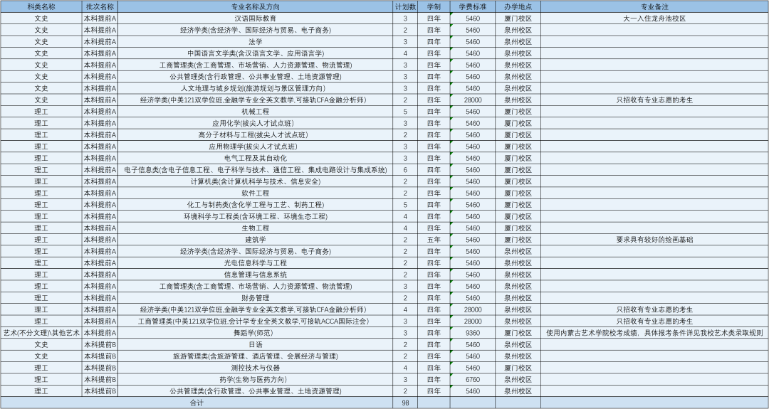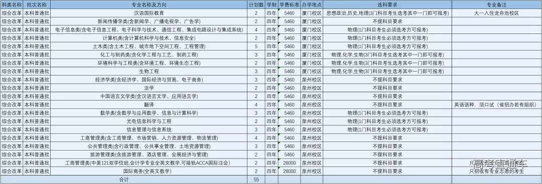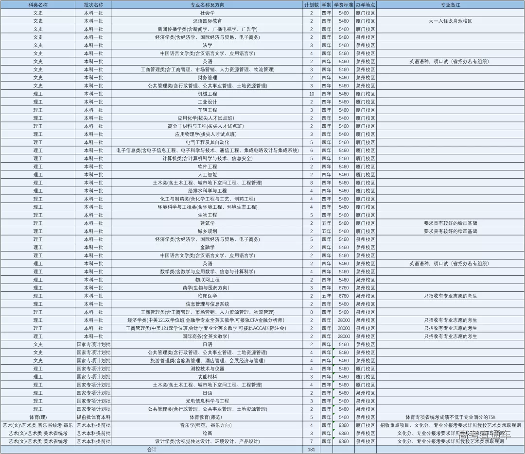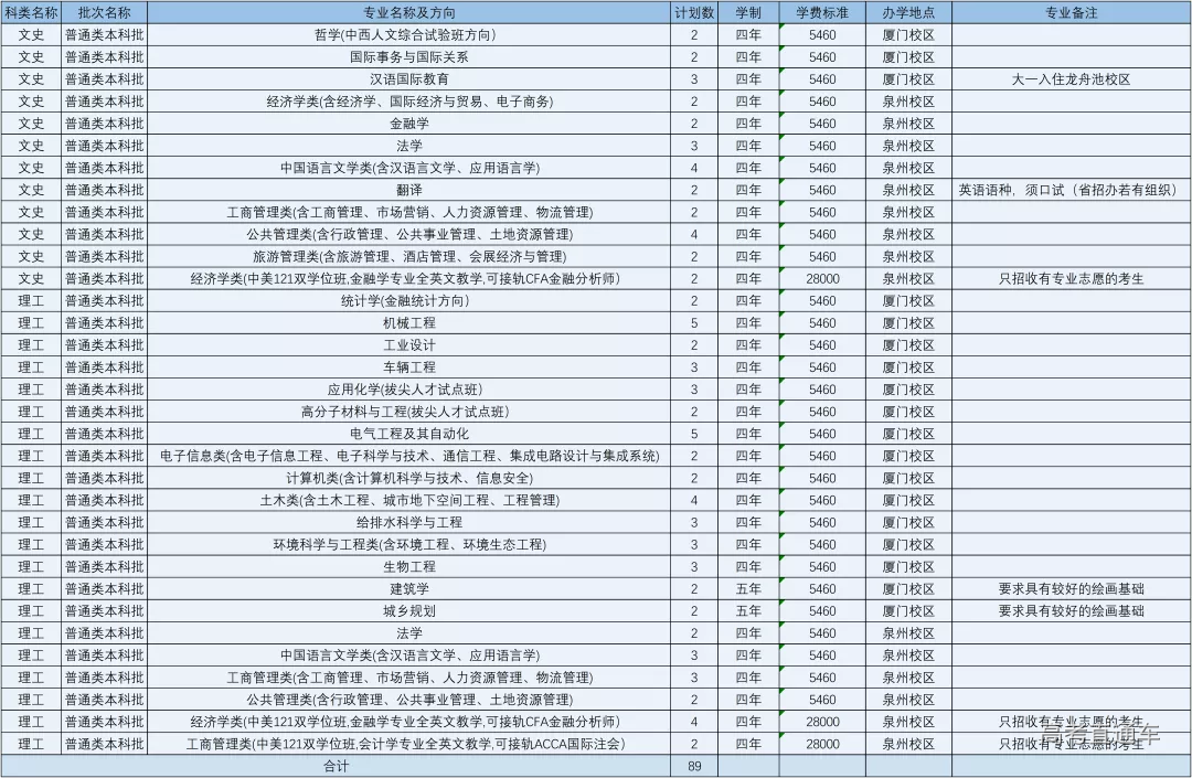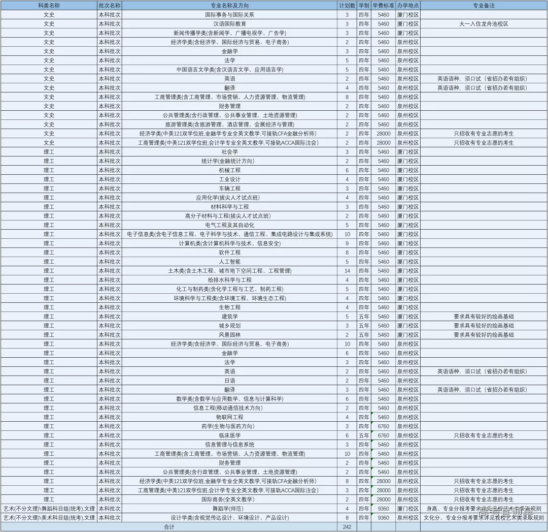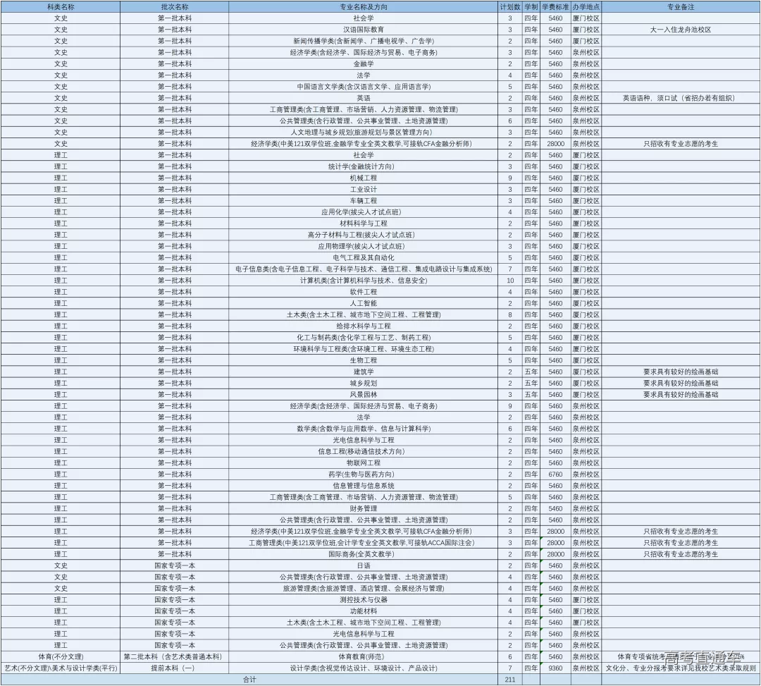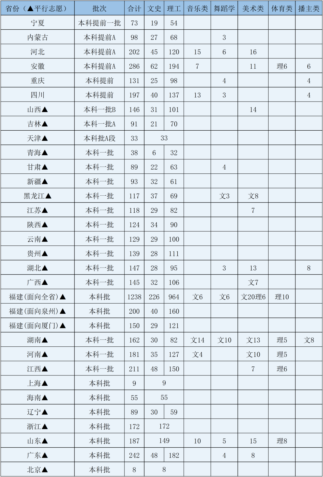 这个九月,我们华大见! 学校性质 直属中央统战部领导 是中央统战部、教育部与福建省共建的综合性大学 福建省“双一流”建设高校 博士学位授权高校 办学地点 厦门校区——福建省厦门市 泉州校区——福建省泉州市 学校排名 2018中国最好大学排名——第86位 2018年中国高校自然指数排行榜——第70位 2019泰晤士高等教育中国内地排行榜——第65位 学科建设 化学、工程、材料科学3个学科 进入ESI世界排名前1% 20个专业入选首批一流本科专业建设“双万计划” 毕业前景 就业及发展机遇好 考研升学率高 与优秀的人在一起 你会变得更优秀 并且幸福感也不会少 2018年薪酬排行榜位列全国119位 在福建省高校中排名第2哦 华侨大学2020年分省分专业普高招生计划 华侨大学2020年各省份艺术类招生计划 提示说明 1.今年音乐舞蹈类招生变化: (1)声乐方向重点招收民族、美声演唱项目;器乐重点招收钢琴、二胡、竹笛、古筝、扬琴、小提琴、大提琴、双簧管、萨克斯等项目。 不属于以上项目的考生,入学后需根据学院要求调剂至上述相应项目学习。 (2)音乐舞蹈专业暂停校考,全部改为“省统考或联考”成绩录取。 2.招生批次变化:福建省批次合并,不再区分本一、本二,改为本科批;山东省改为按专业投档。 3.工商管理学院的会计学、计算机科学与技术学院的数字媒体技术专业只招收境外生。 4.“中美121双学位班”及全英文教学只招收有填报该专业志愿的考生,且不得转入普通班,此外“中美121双学位班”招收具有出国留学意愿且家庭有一定经济能力的考生。 5.临床医学专业只招收有填报该专业志愿的考生。 6.特殊类(含美术类、音乐舞蹈类、播音与主持艺术、高水平运动员)的招生,请详见我校相关类别的招生简章。 (招生计划以各省招生部门公布计划填报手册为准) 福建省(面向全省) 福建省(面向泉州) 福建省(面向厦门) 安徽省 北京市 重庆市 甘肃省 广东省 广西壮族自治区 贵州省 海南省 河北省 河南省 黑龙江省 湖北省 湖南省 吉林省 江苏省 江西省 辽宁省 内蒙古自治区 宁夏回族自治区 青海省 山东省 山西省 陕西省 上海市 四川省 天津市 新疆维吾尔自治区 云南省 浙江省 看完了2020年招生计划和2019年各专业录取分数线 是不是让你更有信心了呢? 希望大家能更好地选择自己的未来 欢迎报考华侨大学!
