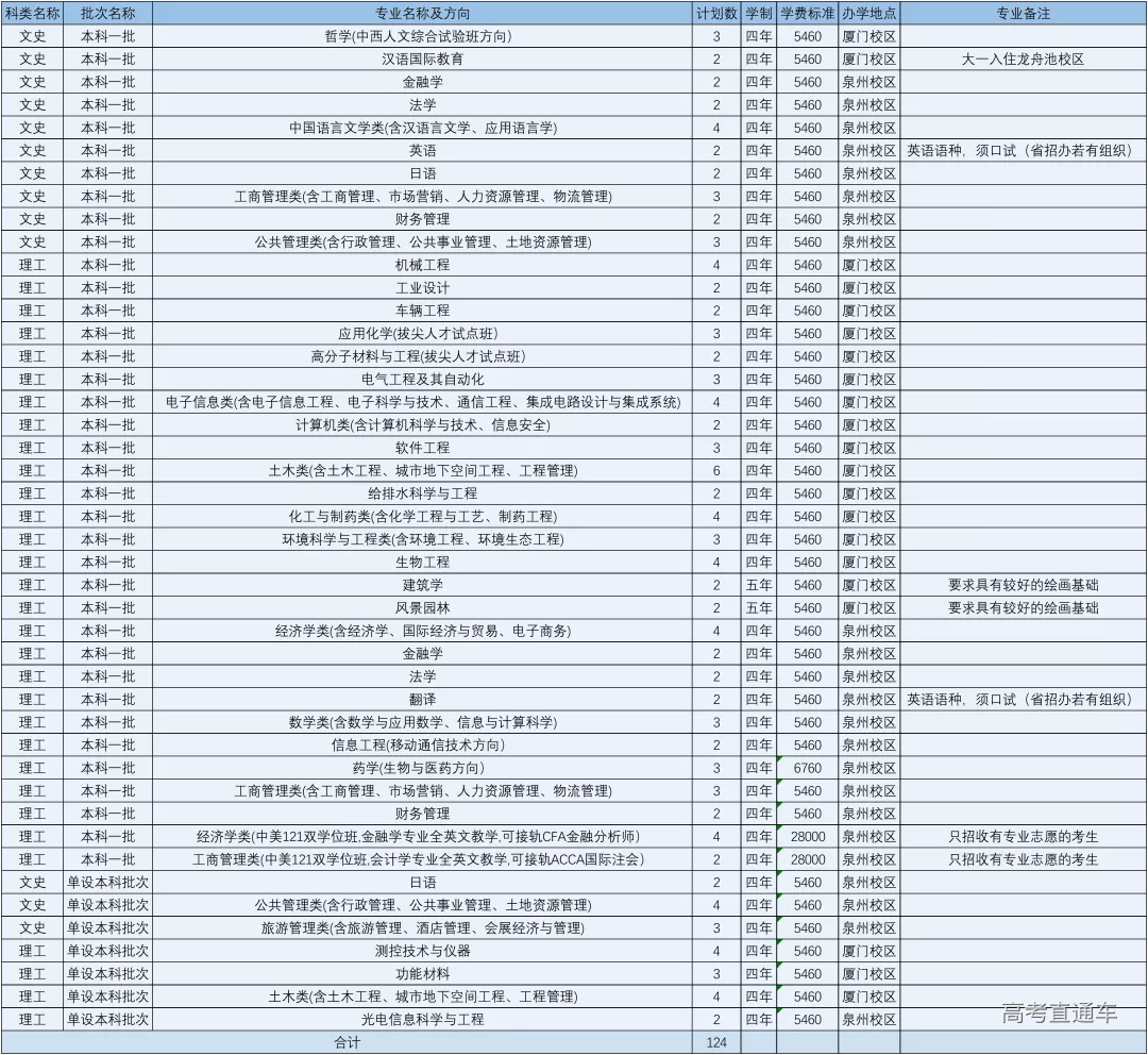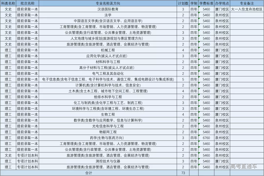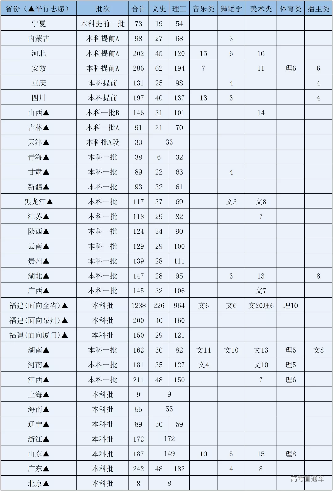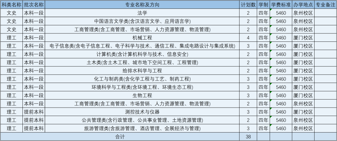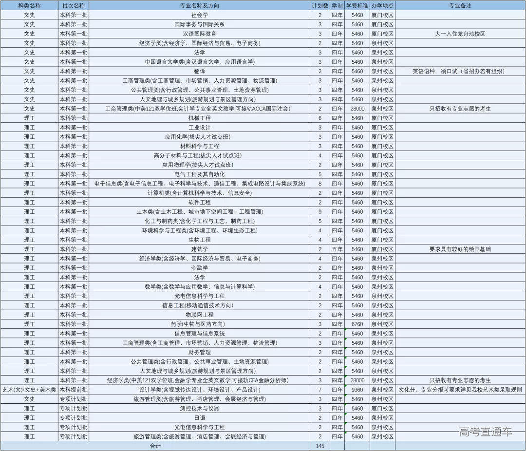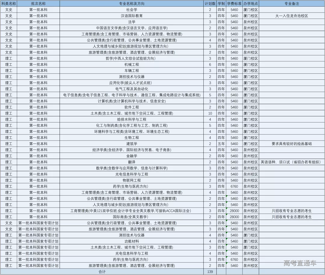 这个九月,我们华大见! 学校性质 直属中央统战部领导 是中央统战部、教育部与福建省共建的综合性大学 福建省“双一流”建设高校 博士学位授权高校 办学地点 厦门校区——福建省厦门市 泉州校区——福建省泉州市 学校排名 2018中国最好大学排名——第86位 2018年中国高校自然指数排行榜——第70位 2019泰晤士高等教育中国内地排行榜——第65位 学科建设 化学、工程、材料科学3个学科 进入ESI世界排名前1% 20个专业入选首批一流本科专业建设“双万计划” 毕业前景 就业及发展机遇好 考研升学率高 与优秀的人在一起 你会变得更优秀 并且幸福感也不会少 2018年薪酬排行榜位列全国119位 在福建省高校中排名第2哦 华侨大学2020年分省分专业普高招生计划 华侨大学2020年各省份艺术类招生计划 提示说明 1.今年音乐舞蹈类招生变化: (1)声乐方向重点招收民族、美声演唱项目;器乐重点招收钢琴、二胡、竹笛、古筝、扬琴、小提琴、大提琴、双簧管、萨克斯等项目。 不属于以上项目的考生,入学后需根据学院要求调剂至上述相应项目学习。 (2)音乐舞蹈专业暂停校考,全部改为“省统考或联考”成绩录取。 2.招生批次变化:福建省批次合并,不再区分本一、本二,改为本科批;山东省改为按专业投档。 3.工商管理学院的会计学、计算机科学与技术学院的数字媒体技术专业只招收境外生。 4.“中美121双学位班”及全英文教学只招收有填报该专业志愿的考生,且不得转入普通班,此外“中美121双学位班”招收具有出国留学意愿且家庭有一定经济能力的考生。 5.临床医学专业只招收有填报该专业志愿的考生。 6.特殊类(含美术类、音乐舞蹈类、播音与主持艺术、高水平运动员)的招生,请详见我校相关类别的招生简章。 (招生计划以各省招生部门公布计划填报手册为准) 福建省(面向全省) 福建省(面向泉州) 福建省(面向厦门) 安徽省 北京市 重庆市 甘肃省 广东省 广西壮族自治区 贵州省 海南省 河北省 河南省 黑龙江省 湖北省 湖南省 吉林省 江苏省 江西省 辽宁省 内蒙古自治区 宁夏回族自治区 青海省 山东省 山西省 陕西省 上海市 四川省 天津市 新疆维吾尔自治区 云南省 浙江省 看完了2020年招生计划和2019年各专业录取分数线 是不是让你更有信心了呢? 希望大家能更好地选择自己的未来 欢迎报考华侨大学!
