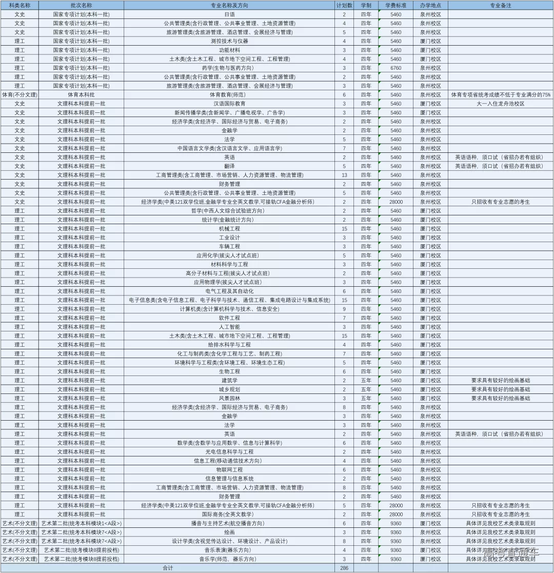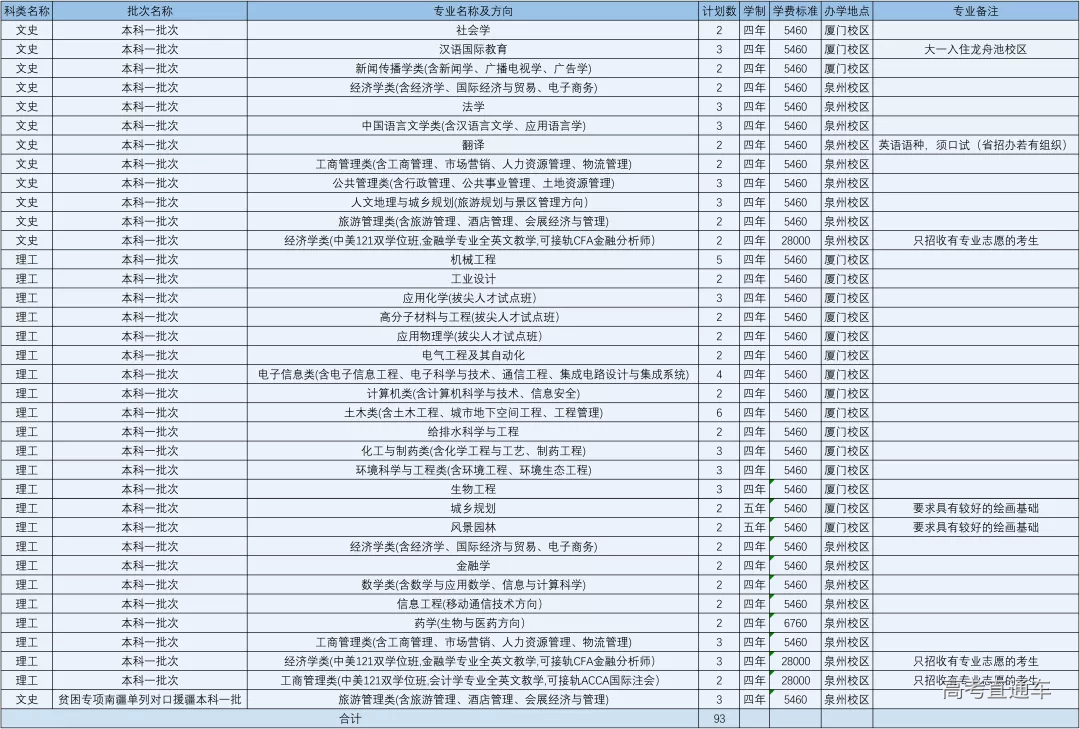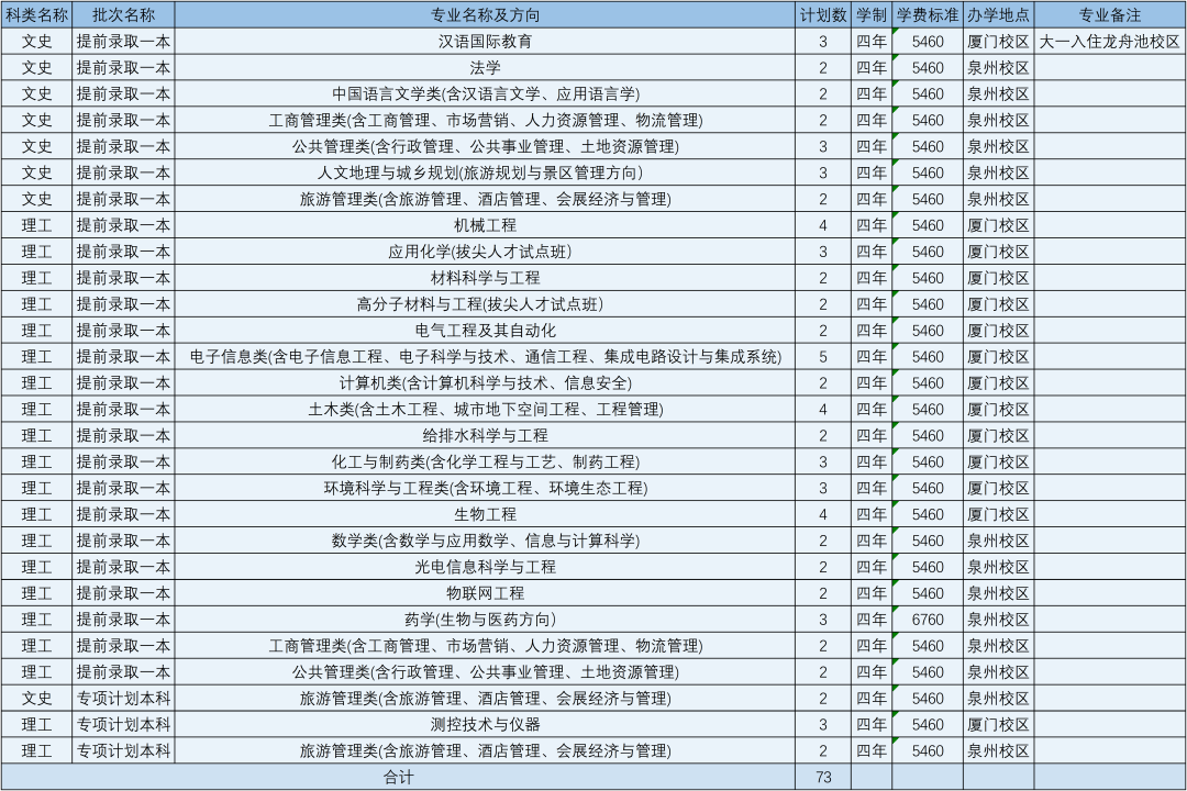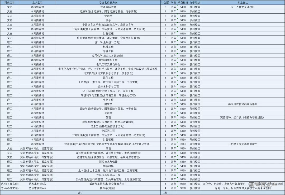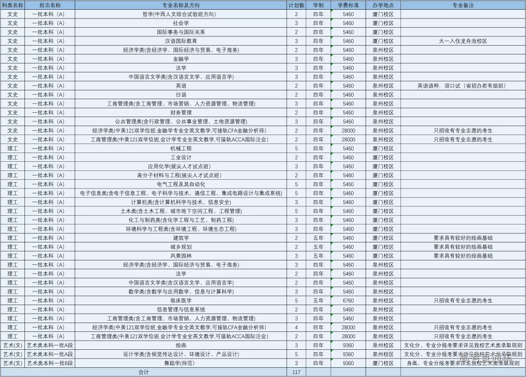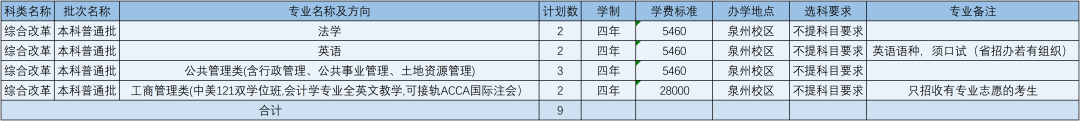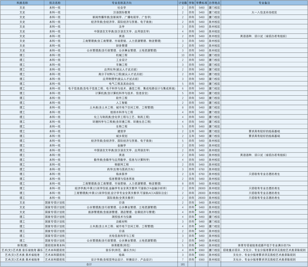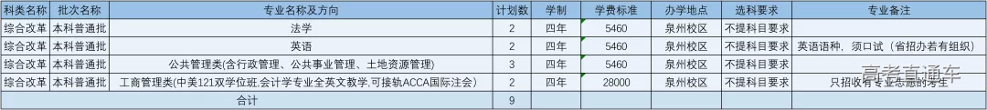 这个九月,我们华大见! 学校性质 直属中央统战部领导 是中央统战部、教育部与福建省共建的综合性大学 福建省“双一流”建设高校 博士学位授权高校 办学地点 厦门校区——福建省厦门市 泉州校区——福建省泉州市 学校排名 2018中国最好大学排名——第86位 2018年中国高校自然指数排行榜——第70位 2019泰晤士高等教育中国内地排行榜——第65位 学科建设 化学、工程、材料科学3个学科 进入ESI世界排名前1% 20个专业入选首批一流本科专业建设“双万计划” 毕业前景 就业及发展机遇好 考研升学率高 与优秀的人在一起 你会变得更优秀 并且幸福感也不会少 2018年薪酬排行榜位列全国119位 在福建省高校中排名第2哦 华侨大学2020年分省分专业普高招生计划 华侨大学2020年各省份艺术类招生计划 提示说明 1.今年音乐舞蹈类招生变化: (1)声乐方向重点招收民族、美声演唱项目;器乐重点招收钢琴、二胡、竹笛、古筝、扬琴、小提琴、大提琴、双簧管、萨克斯等项目。 不属于以上项目的考生,入学后需根据学院要求调剂至上述相应项目学习。 (2)音乐舞蹈专业暂停校考,全部改为“省统考或联考”成绩录取。 2.招生批次变化:福建省批次合并,不再区分本一、本二,改为本科批;山东省改为按专业投档。 3.工商管理学院的会计学、计算机科学与技术学院的数字媒体技术专业只招收境外生。 4.“中美121双学位班”及全英文教学只招收有填报该专业志愿的考生,且不得转入普通班,此外“中美121双学位班”招收具有出国留学意愿且家庭有一定经济能力的考生。 5.临床医学专业只招收有填报该专业志愿的考生。 6.特殊类(含美术类、音乐舞蹈类、播音与主持艺术、高水平运动员)的招生,请详见我校相关类别的招生简章。 (招生计划以各省招生部门公布计划填报手册为准) 福建省(面向全省) 福建省(面向泉州) 福建省(面向厦门) 安徽省 北京市 重庆市 甘肃省 广东省 广西壮族自治区 贵州省 海南省 河北省 河南省 黑龙江省 湖北省 湖南省 吉林省 江苏省 江西省 辽宁省 内蒙古自治区 宁夏回族自治区 青海省 山东省 山西省 陕西省 上海市 四川省 天津市 新疆维吾尔自治区 云南省 浙江省 看完了2020年招生计划和2019年各专业录取分数线 是不是让你更有信心了呢? 希望大家能更好地选择自己的未来 欢迎报考华侨大学!