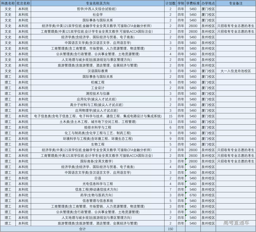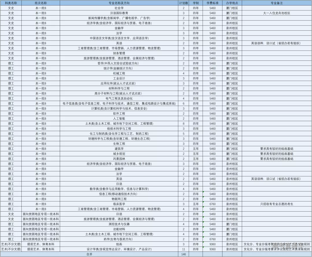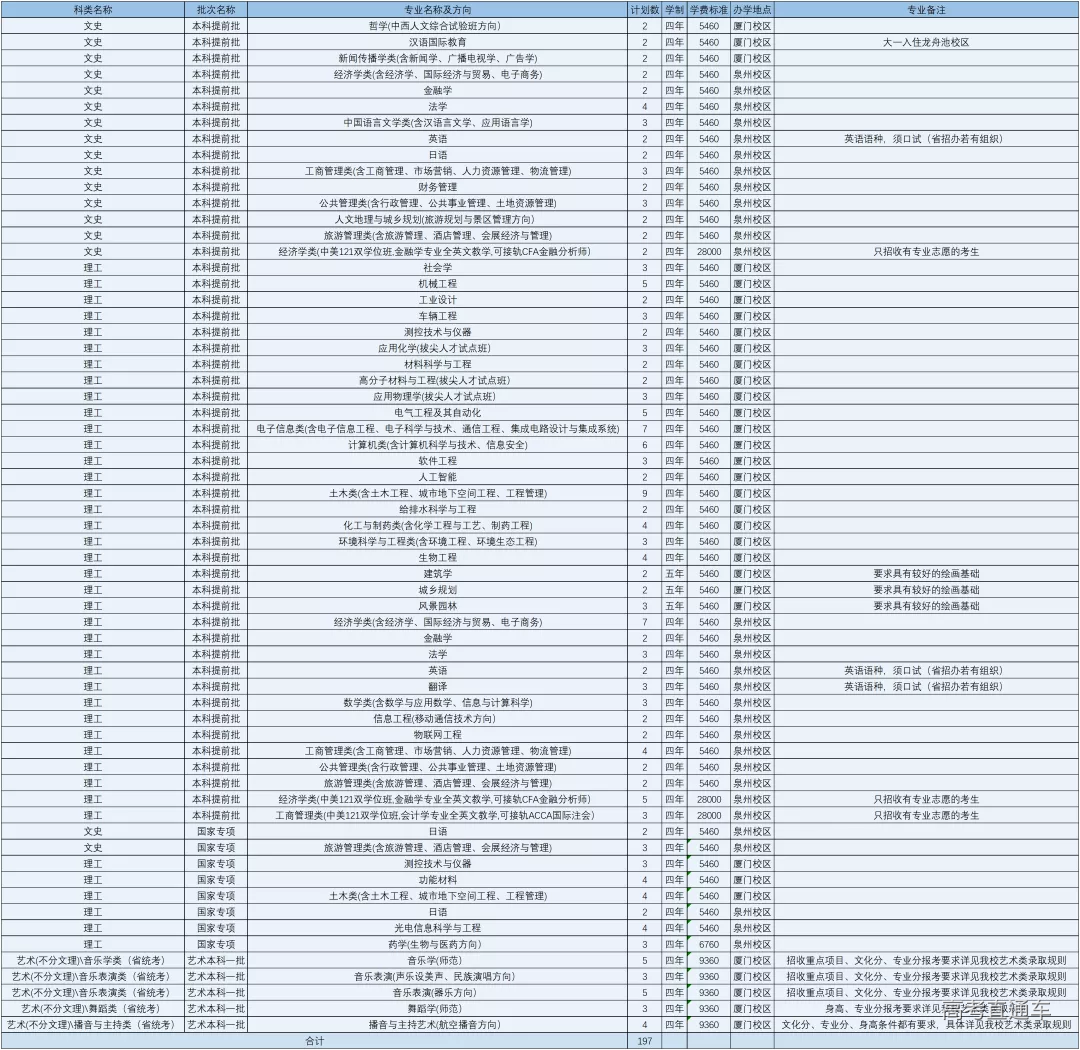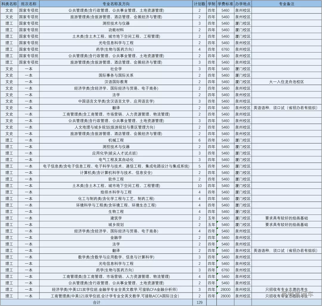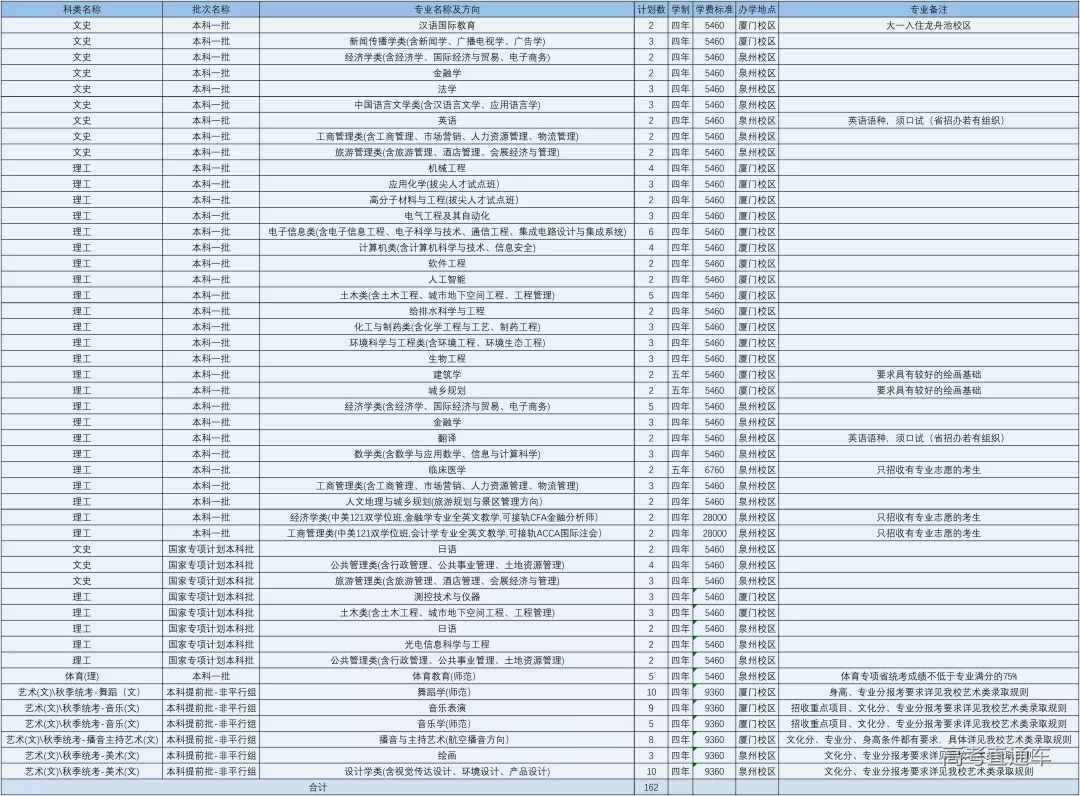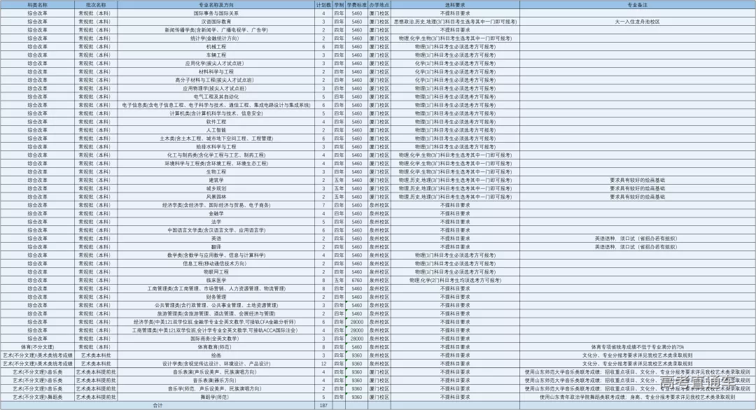 这个九月,我们华大见! 学校性质 直属中央统战部领导 是中央统战部、教育部与福建省共建的综合性大学 福建省“双一流”建设高校 博士学位授权高校 办学地点 厦门校区——福建省厦门市 泉州校区——福建省泉州市 学校排名 2018中国最好大学排名——第86位 2018年中国高校自然指数排行榜——第70位 2019泰晤士高等教育中国内地排行榜——第65位 学科建设 化学、工程、材料科学3个学科 进入ESI世界排名前1% 20个专业入选首批一流本科专业建设“双万计划” 毕业前景 就业及发展机遇好 考研升学率高 与优秀的人在一起 你会变得更优秀 并且幸福感也不会少 2018年薪酬排行榜位列全国119位 在福建省高校中排名第2哦 华侨大学2020年分省分专业普高招生计划 华侨大学2020年各省份艺术类招生计划 提示说明 1.今年音乐舞蹈类招生变化: (1)声乐方向重点招收民族、美声演唱项目;器乐重点招收钢琴、二胡、竹笛、古筝、扬琴、小提琴、大提琴、双簧管、萨克斯等项目。 不属于以上项目的考生,入学后需根据学院要求调剂至上述相应项目学习。 (2)音乐舞蹈专业暂停校考,全部改为“省统考或联考”成绩录取。 2.招生批次变化:福建省批次合并,不再区分本一、本二,改为本科批;山东省改为按专业投档。 3.工商管理学院的会计学、计算机科学与技术学院的数字媒体技术专业只招收境外生。 4.“中美121双学位班”及全英文教学只招收有填报该专业志愿的考生,且不得转入普通班,此外“中美121双学位班”招收具有出国留学意愿且家庭有一定经济能力的考生。 5.临床医学专业只招收有填报该专业志愿的考生。 6.特殊类(含美术类、音乐舞蹈类、播音与主持艺术、高水平运动员)的招生,请详见我校相关类别的招生简章。 (招生计划以各省招生部门公布计划填报手册为准) 福建省(面向全省) 福建省(面向泉州) 福建省(面向厦门) 安徽省 北京市 重庆市 甘肃省 广东省 广西壮族自治区 贵州省 海南省 河北省 河南省 黑龙江省 湖北省 湖南省 吉林省 江苏省 江西省 辽宁省 内蒙古自治区 宁夏回族自治区 青海省 山东省 山西省 陕西省 上海市 四川省 天津市 新疆维吾尔自治区 云南省 浙江省 看完了2020年招生计划和2019年各专业录取分数线 是不是让你更有信心了呢? 希望大家能更好地选择自己的未来 欢迎报考华侨大学!