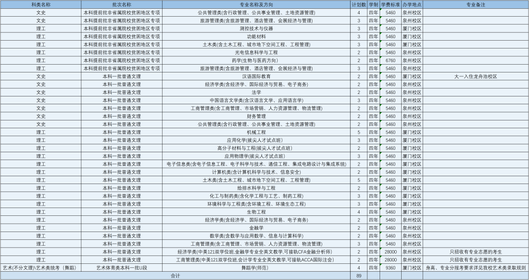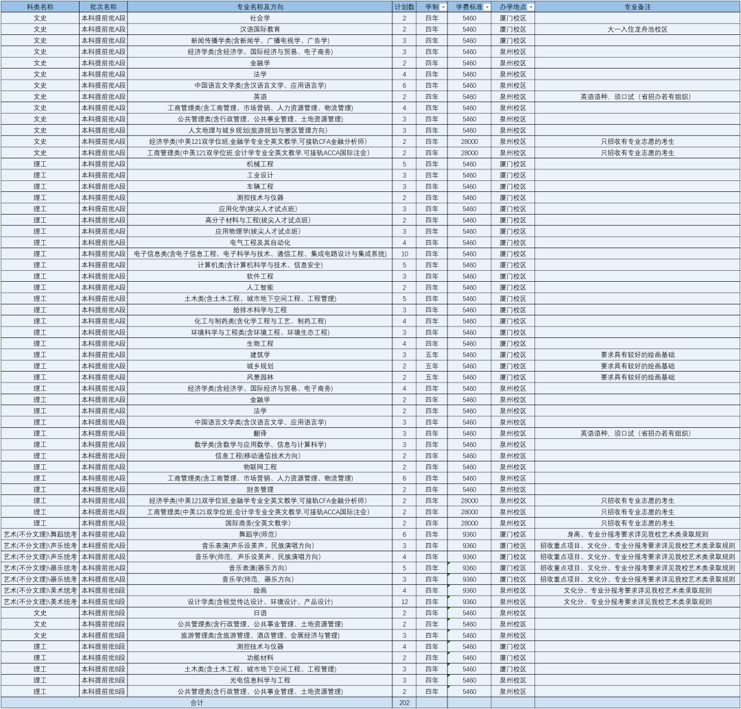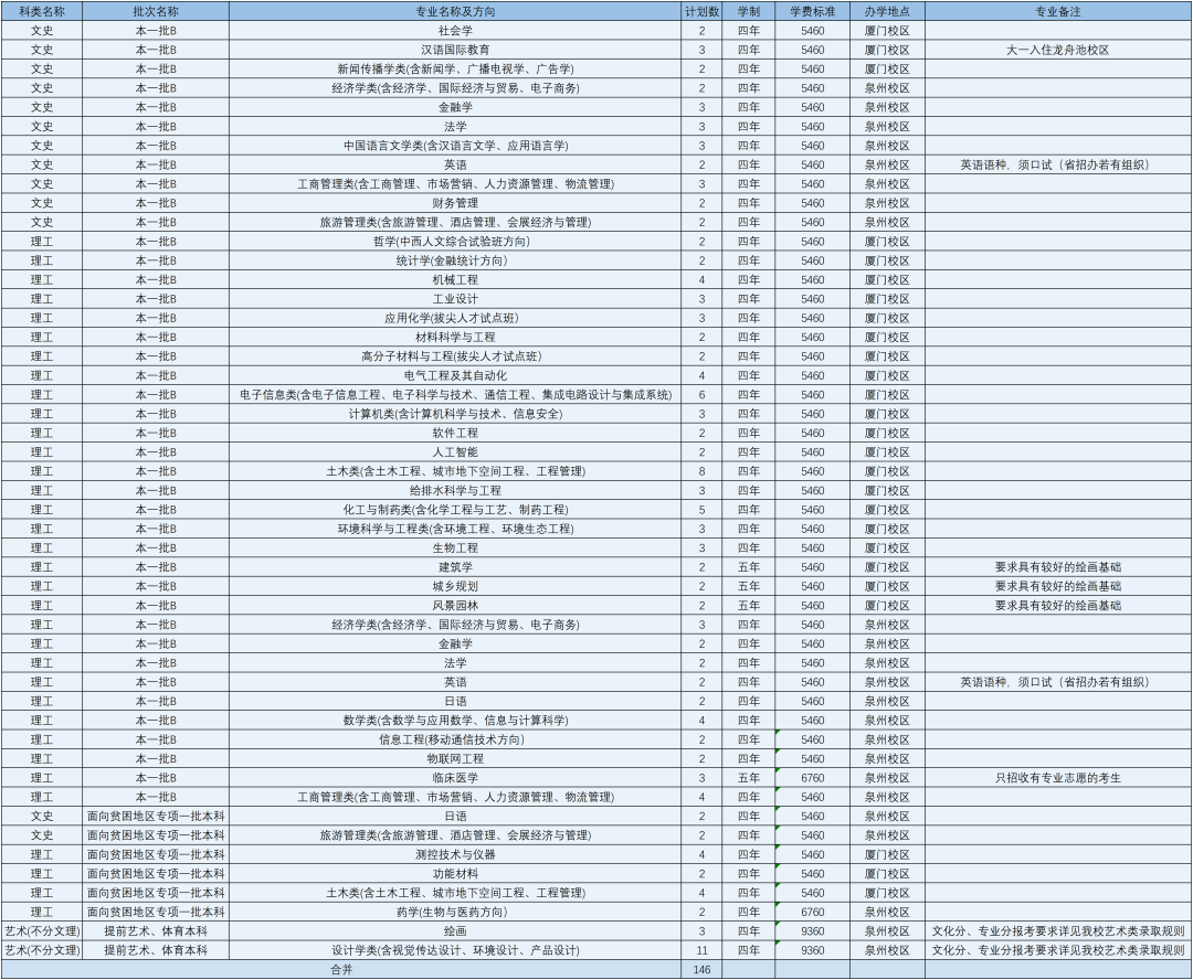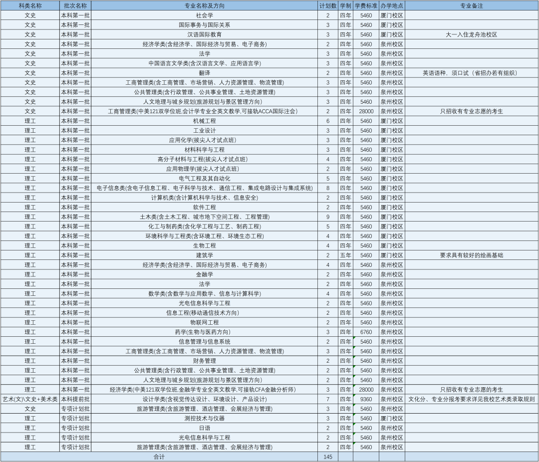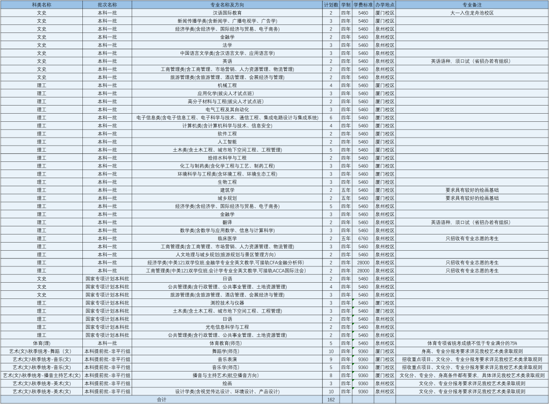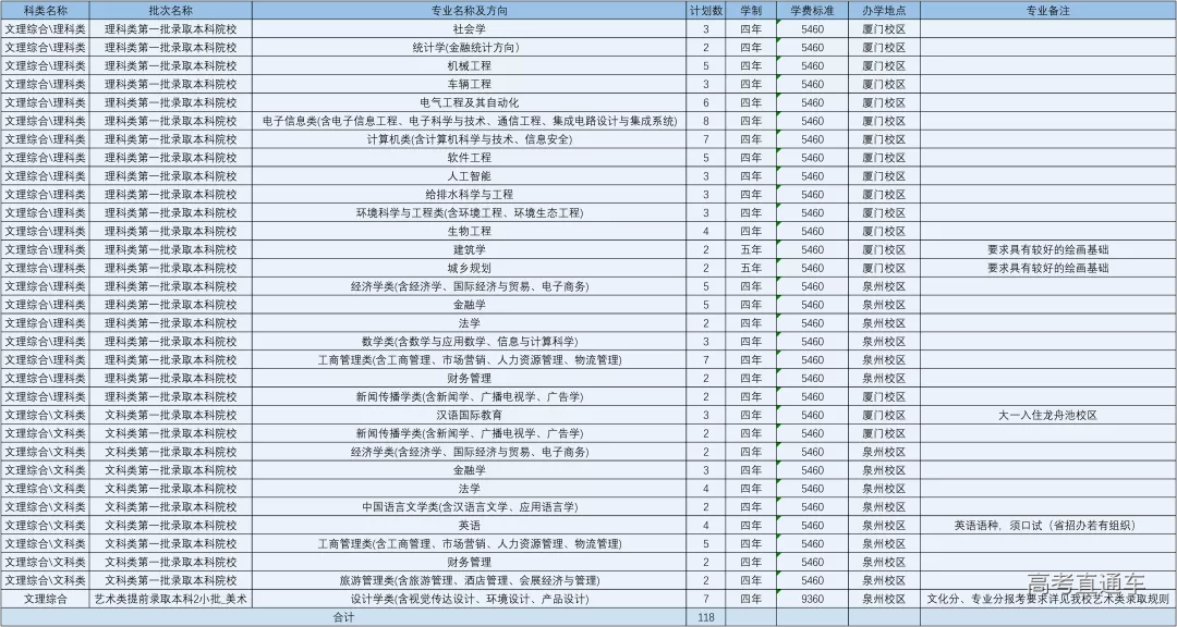这个九月,我们华大见! 学校性质 直属中央统战部领导 是中央统战部、教育部与福建省共建的综合性大学 福建省“双一流”建设高校 博士学位授权高校 办学地点 厦门校区——福建省厦门市 泉州校区——福建省泉州市 学校排名 2018中国最好大学排名——第86位 2018年中国高校自然指数排行榜——第70位 2019泰晤士高等教育中国内地排行榜——第65位 学科建设 化学、工程、材料科学3个学科 进入ESI世界排名前1% 20个专业入选首批一流本科专业建设“双万计划” 毕业前景 就业及发展机遇好 考研升学率高 与优秀的人在一起 你会变得更优秀 并且幸福感也不会少 2018年薪酬排行榜位列全国119位 在福建省高校中排名第2哦 华侨大学2020年分省分专业普高招生计划 华侨大学2020年各省份艺术类招生计划 提示说明 1.今年音乐舞蹈类招生变化: (1)声乐方向重点招收民族、美声演唱项目;器乐重点招收钢琴、二胡、竹笛、古筝、扬琴、小提琴、大提琴、双簧管、萨克斯等项目。 不属于以上项目的考生,入学后需根据学院要求调剂至上述相应项目学习。 (2)音乐舞蹈专业暂停校考,全部改为“省统考或联考”成绩录取。 2.招生批次变化:福建省批次合并,不再区分本一、本二,改为本科批;山东省改为按专业投档。 3.工商管理学院的会计学、计算机科学与技术学院的数字媒体技术专业只招收境外生。 4.“中美121双学位班”及全英文教学只招收有填报该专业志愿的考生,且不得转入普通班,此外“中美121双学位班”招收具有出国留学意愿且家庭有一定经济能力的考生。 5.临床医学专业只招收有填报该专业志愿的考生。 6.特殊类(含美术类、音乐舞蹈类、播音与主持艺术、高水平运动员)的招生,请详见我校相关类别的招生简章。 (招生计划以各省招生部门公布计划填报手册为准) 福建省(面向全省) 福建省(面向泉州) 福建省(面向厦门) 安徽省 北京市 重庆市 甘肃省 广东省 广西壮族自治区 贵州省 海南省 河北省 河南省 黑龙江省 湖北省 湖南省 吉林省 江苏省 江西省 辽宁省 内蒙古自治区 宁夏回族自治区 青海省 山东省 山西省 陕西省 上海市 四川省 天津市 新疆维吾尔自治区 云南省 浙江省 看完了2020年招生计划和2019年各专业录取分数线 是不是让你更有信心了呢? 希望大家能更好地选择自己的未来 欢迎报考华侨大学!