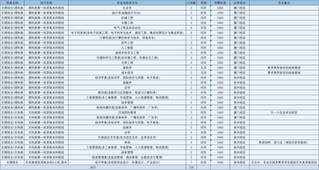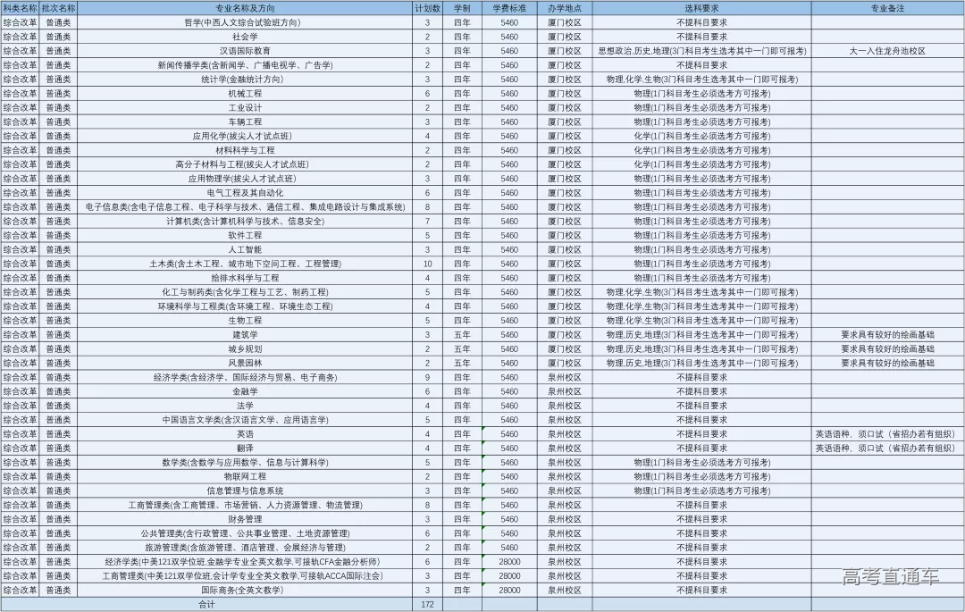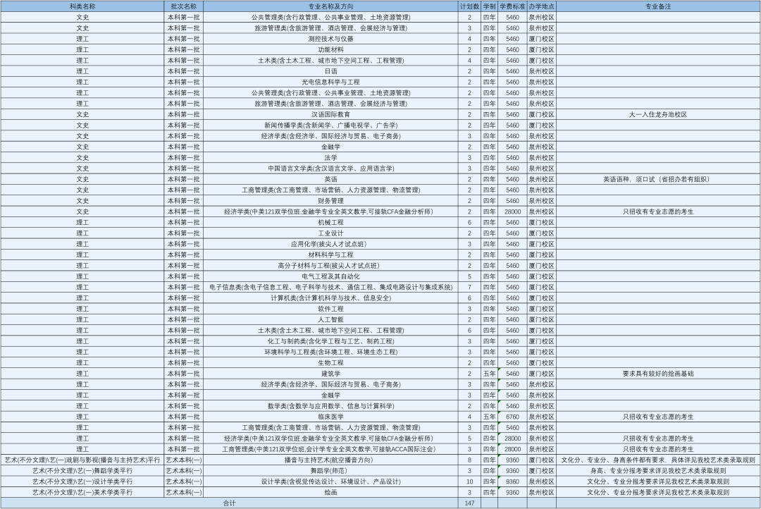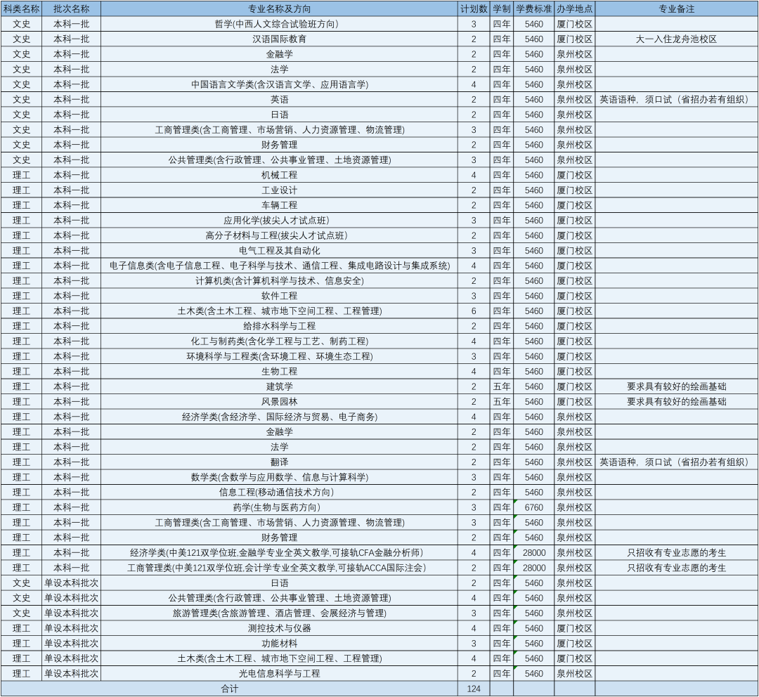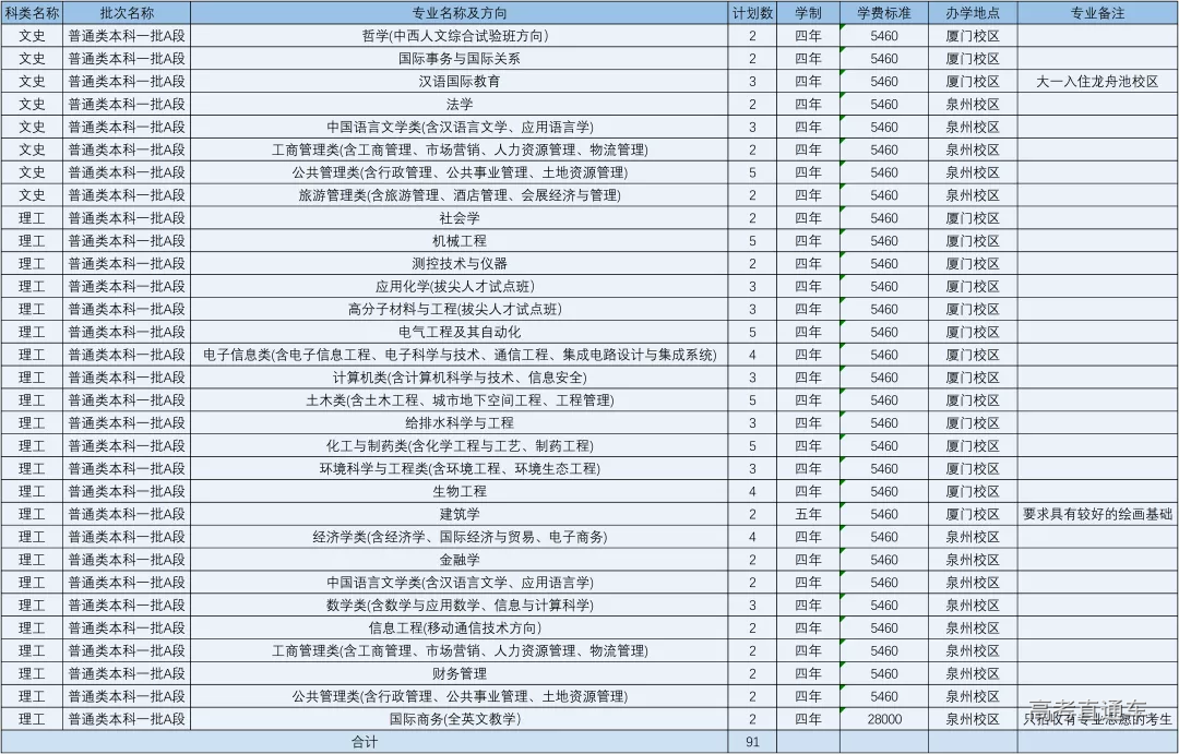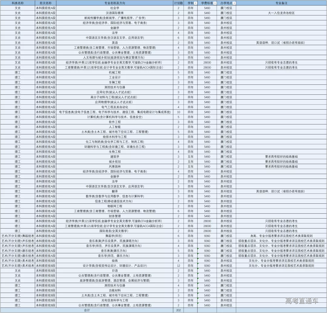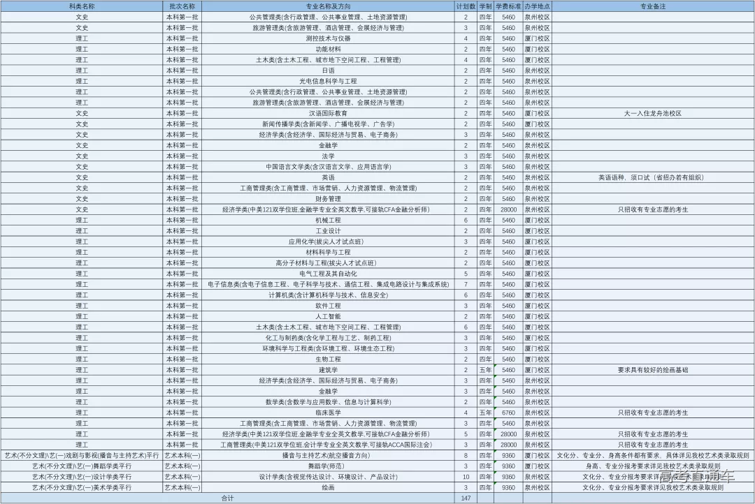 这个九月,我们华大见! 学校性质 直属中央统战部领导 是中央统战部、教育部与福建省共建的综合性大学 福建省“双一流”建设高校 博士学位授权高校 办学地点 厦门校区——福建省厦门市 泉州校区——福建省泉州市 学校排名 2018中国最好大学排名——第86位 2018年中国高校自然指数排行榜——第70位 2019泰晤士高等教育中国内地排行榜——第65位 学科建设 化学、工程、材料科学3个学科 进入ESI世界排名前1% 20个专业入选首批一流本科专业建设“双万计划” 毕业前景 就业及发展机遇好 考研升学率高 与优秀的人在一起 你会变得更优秀 并且幸福感也不会少 2018年薪酬排行榜位列全国119位 在福建省高校中排名第2哦 华侨大学2020年分省分专业普高招生计划 华侨大学2020年各省份艺术类招生计划 提示说明 1.今年音乐舞蹈类招生变化: (1)声乐方向重点招收民族、美声演唱项目;器乐重点招收钢琴、二胡、竹笛、古筝、扬琴、小提琴、大提琴、双簧管、萨克斯等项目。 不属于以上项目的考生,入学后需根据学院要求调剂至上述相应项目学习。 (2)音乐舞蹈专业暂停校考,全部改为“省统考或联考”成绩录取。 2.招生批次变化:福建省批次合并,不再区分本一、本二,改为本科批;山东省改为按专业投档。 3.工商管理学院的会计学、计算机科学与技术学院的数字媒体技术专业只招收境外生。 4.“中美121双学位班”及全英文教学只招收有填报该专业志愿的考生,且不得转入普通班,此外“中美121双学位班”招收具有出国留学意愿且家庭有一定经济能力的考生。 5.临床医学专业只招收有填报该专业志愿的考生。 6.特殊类(含美术类、音乐舞蹈类、播音与主持艺术、高水平运动员)的招生,请详见我校相关类别的招生简章。 (招生计划以各省招生部门公布计划填报手册为准) 福建省(面向全省) 福建省(面向泉州) 福建省(面向厦门) 安徽省 北京市 重庆市 甘肃省 广东省 广西壮族自治区 贵州省 海南省 河北省 河南省 黑龙江省 湖北省 湖南省 吉林省 江苏省 江西省 辽宁省 内蒙古自治区 宁夏回族自治区 青海省 山东省 山西省 陕西省 上海市 四川省 天津市 新疆维吾尔自治区 云南省 浙江省 看完了2020年招生计划和2019年各专业录取分数线 是不是让你更有信心了呢? 希望大家能更好地选择自己的未来 欢迎报考华侨大学!