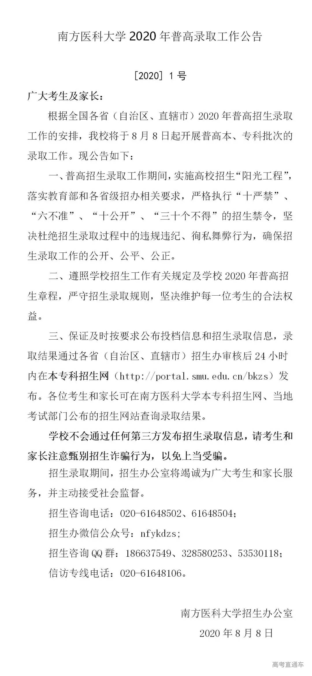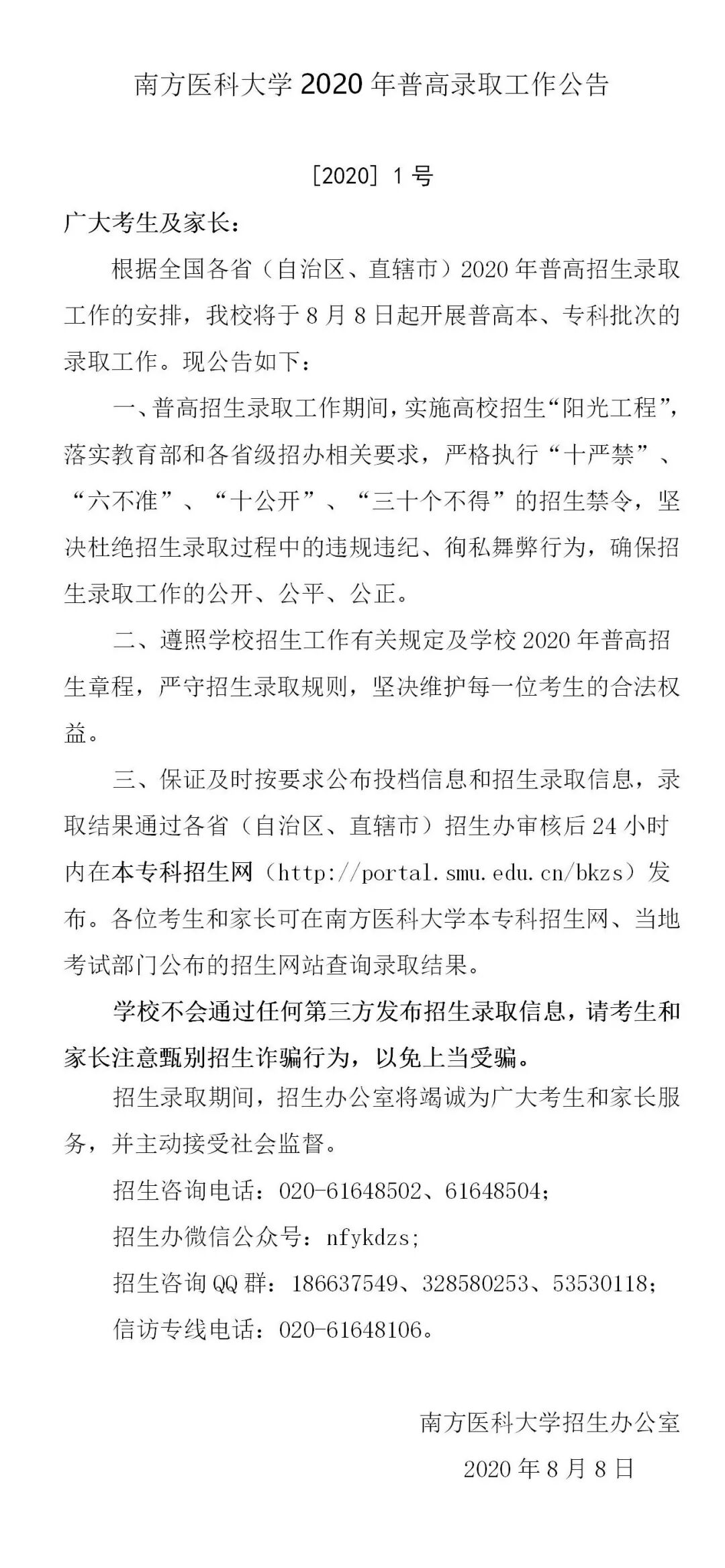 【2020】1号 | 南方医科大学2020年普高录取工作公告