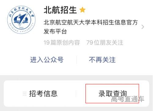 微信搜索北航招生进入公众号点击“录取查询”进行查询。查询方式与官网相同。