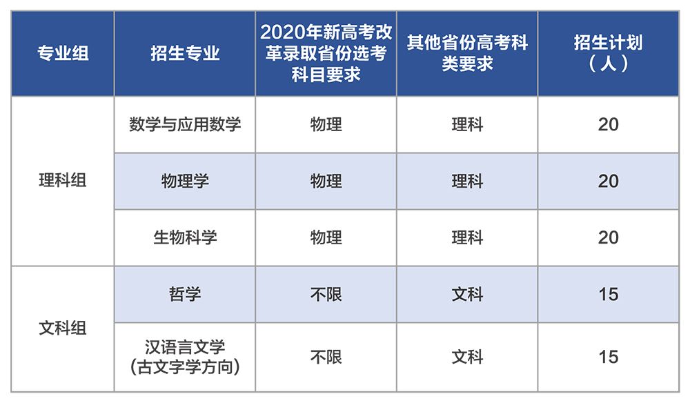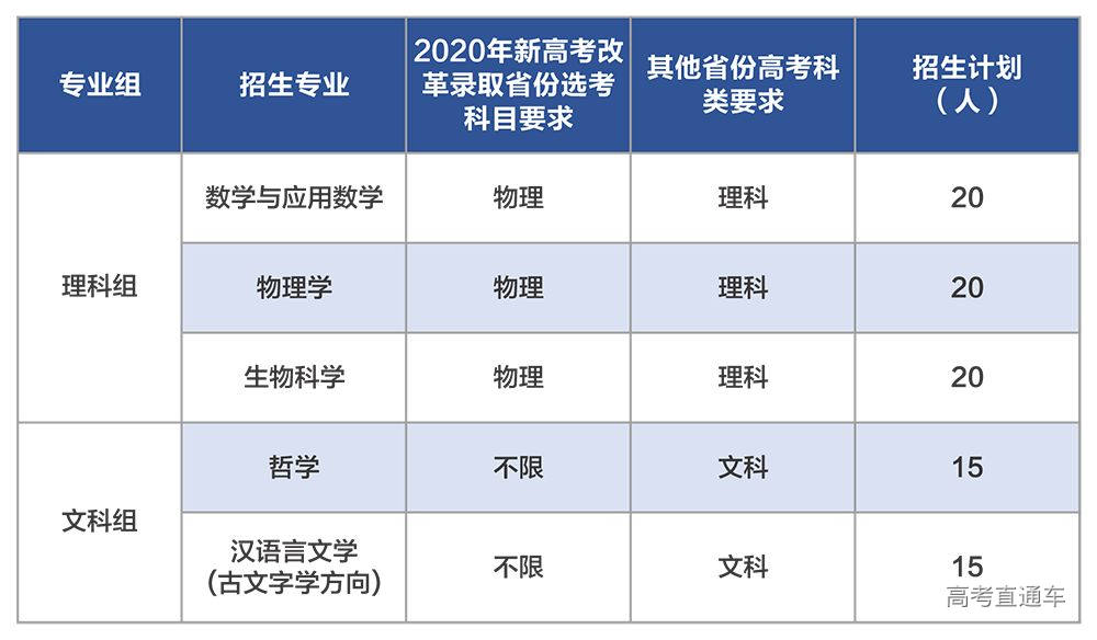 服务国家重大战略需求的基础理科学科以及国家人才紧缺的人文社会科学领域,招生专业、选考科目、科类要求及招生计划见下表: