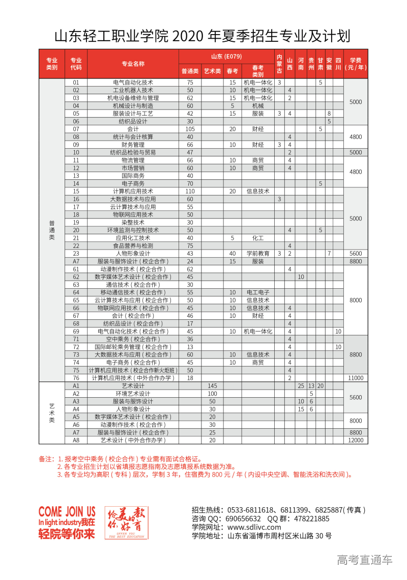山东轻工职业学院2020年夏季招生专业及计划