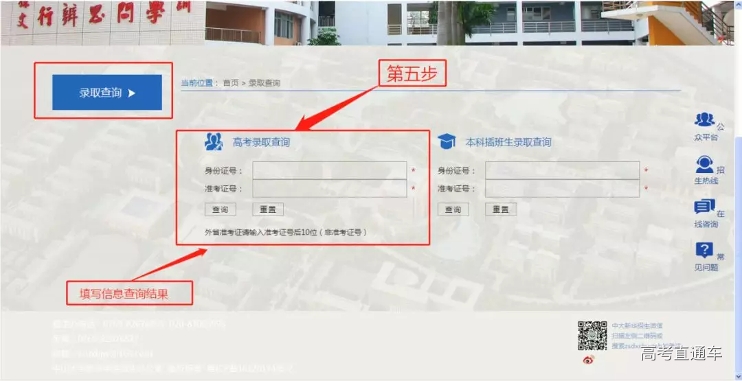 考生关注“中山大学新华学院招生办公室”官方微信公众号,在公众号页面底部点击“招生信息”一栏,点击进入“录取查询”,考生可通过填写身份证号和准考证号等信息进行查询,即可查询考生的录取结果。具体操作如下: