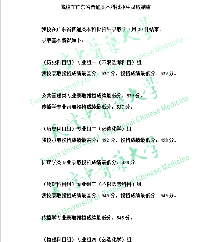天津中医药大学2024年在广东省普通类本科批招生录取结束