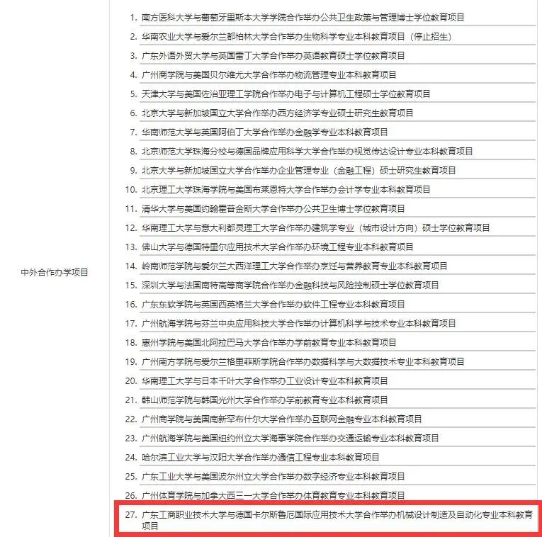 教育部中外合作办学官网截图 该项目学制四年,纳入国家普通高等教育招生计划,自2026年起招生,每年计划招收120人。 项目深度融合德国应用技术教学模式,近四成课程由德方提供,核心课程德方教师课占比过半。学生修业期满且符合双方毕业和学位授予条件者,可同时获得广东工商职业技术大学本科学历证书和学士学位证书以及德国卡尔斯鲁厄国际应用技术大学工程学学士学位证书,实现“不出国门留学”。 双学位认证将为学生升学深造、跨国就业及职业发展拓宽路径,助力其成长为高端技能型人才。 教育部中外合作办学官网截图 该项目通过引进德方成熟的机械设计制造及自动化专业教学体系和“教学—产业融合发展模式”,结合我国机械设计制造及自动化行业发展趋势和典型技术应用场景,着力培养具有扎实科学理论基础、突出现代产业实践能力、完善职业发展体系、创新精神与工匠精神兼备的高素质应用型人才。毕业生将面向机械设计、机械加工及智能制造领域,胜任机械设计制造及自动化相关系统运维、数据标注与处理、应用开发及技术管理等工作,服务国家高质量发展和新型工业化进程。 德国卡尔斯鲁厄国际应用技术大学(Karlshochschule International University)成立于2004年,其办学渊源可追溯至1903年的默克尔学院(Merkur Akademie),是一所位于德国巴登-符腾堡州卡尔斯鲁厄市的知名私立应用技术大学,学校设有26个国家认证本科专业和7个硕士专业。 该项目的成功获批,为学校深化国际交流合作开辟了全新赛道,学校将以此为契机,进一步完善中外合作办学治理体系,深化产教融合与国际协同育人实践,持续提升办学层次与国际影响力,为培养更多具有全球视野与实践能力的高素质应用型人才贡献力量。