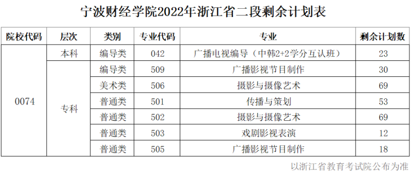 广播影视节目制作(中韩2+2学分互认班)、传播与策划、摄影与摄像艺术、戏剧影视表演、广播影视节目制作共5个专业还有274个剩余计划,欢迎二段考生在7月24日8:30—7月25日17:30规定的时间内登录浙江省教育考试院网站(www.zjzs.net)填报志愿。