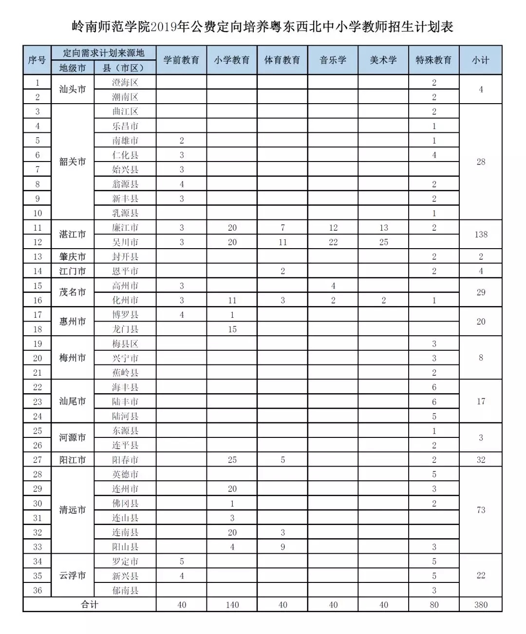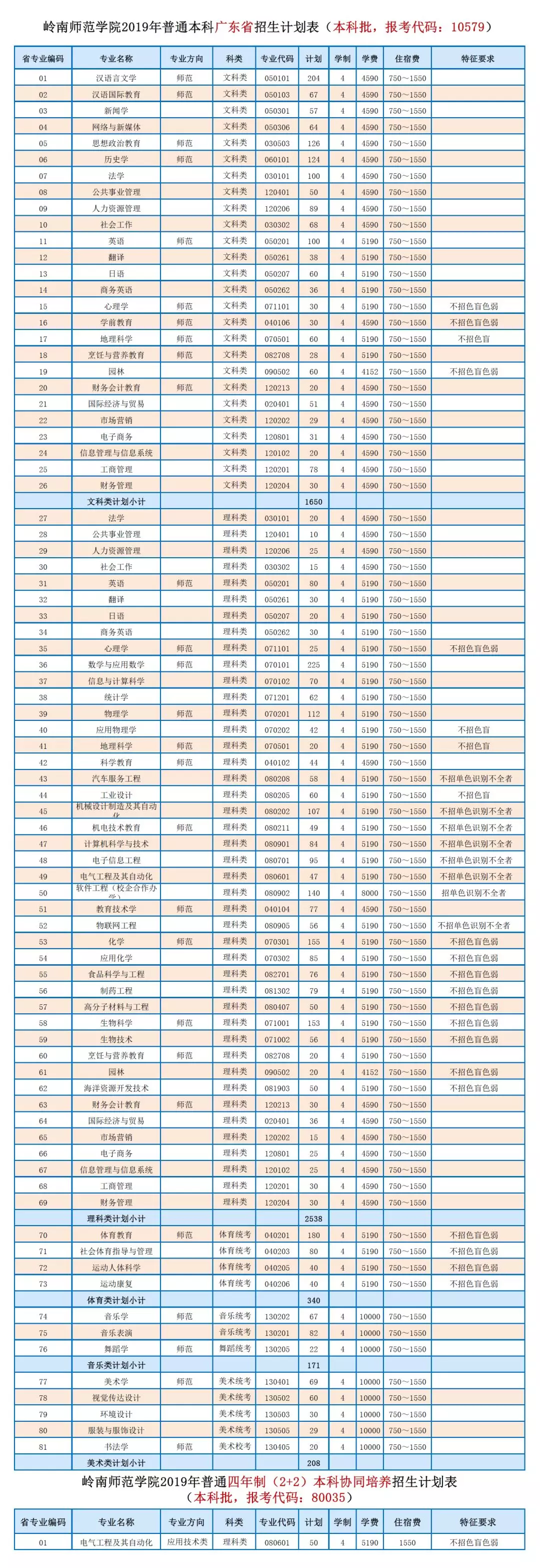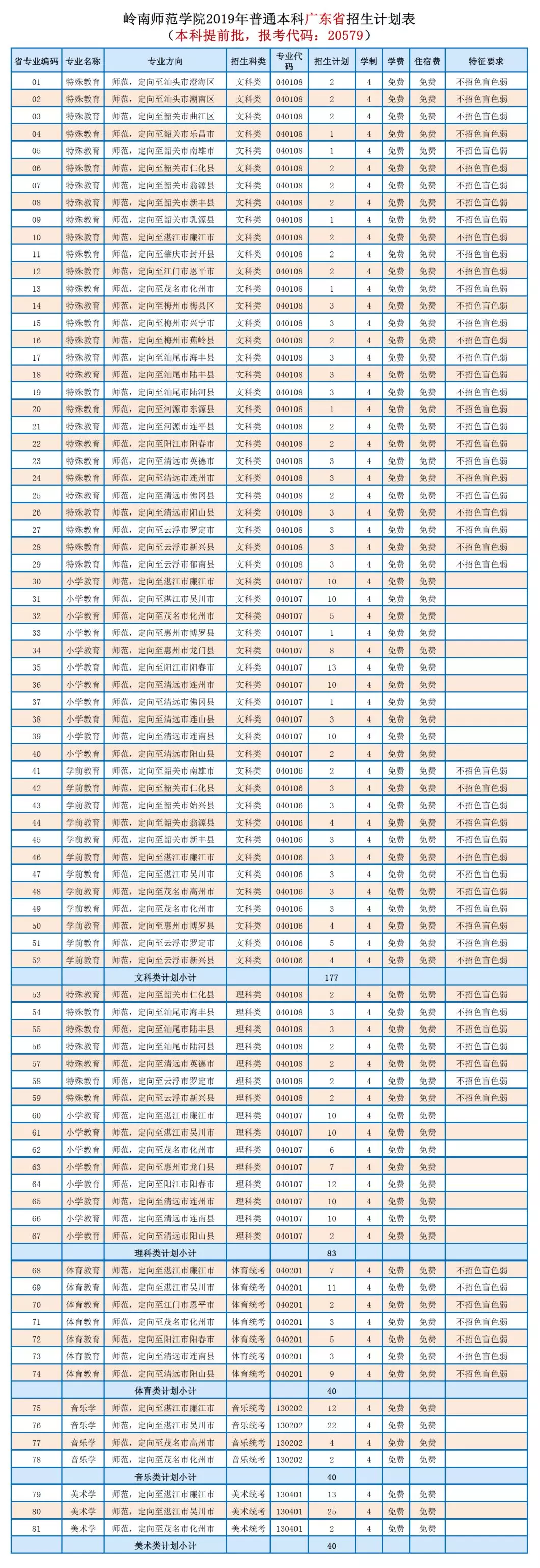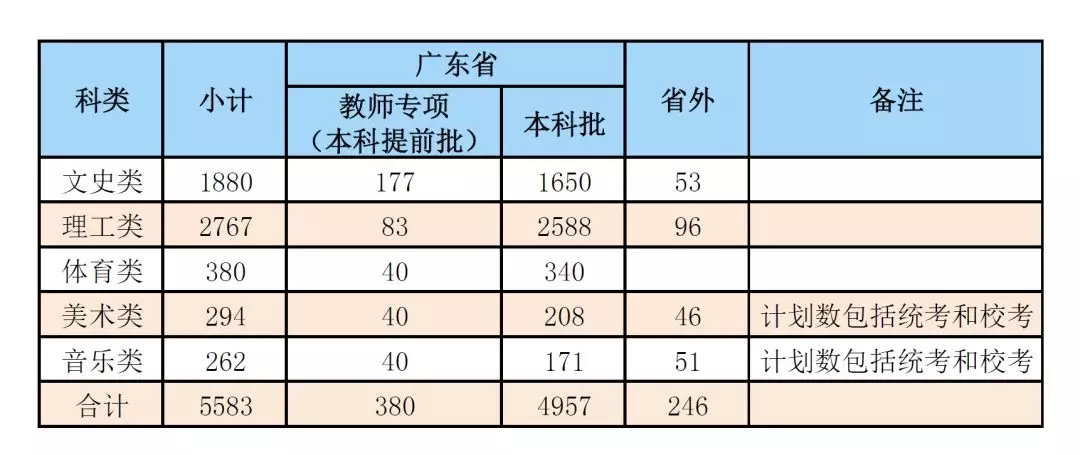 2019年普通本科广东省招生计划表