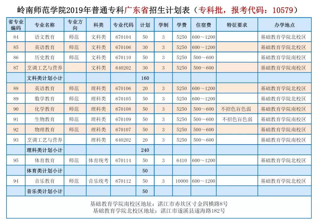 2019年专科招生计划表