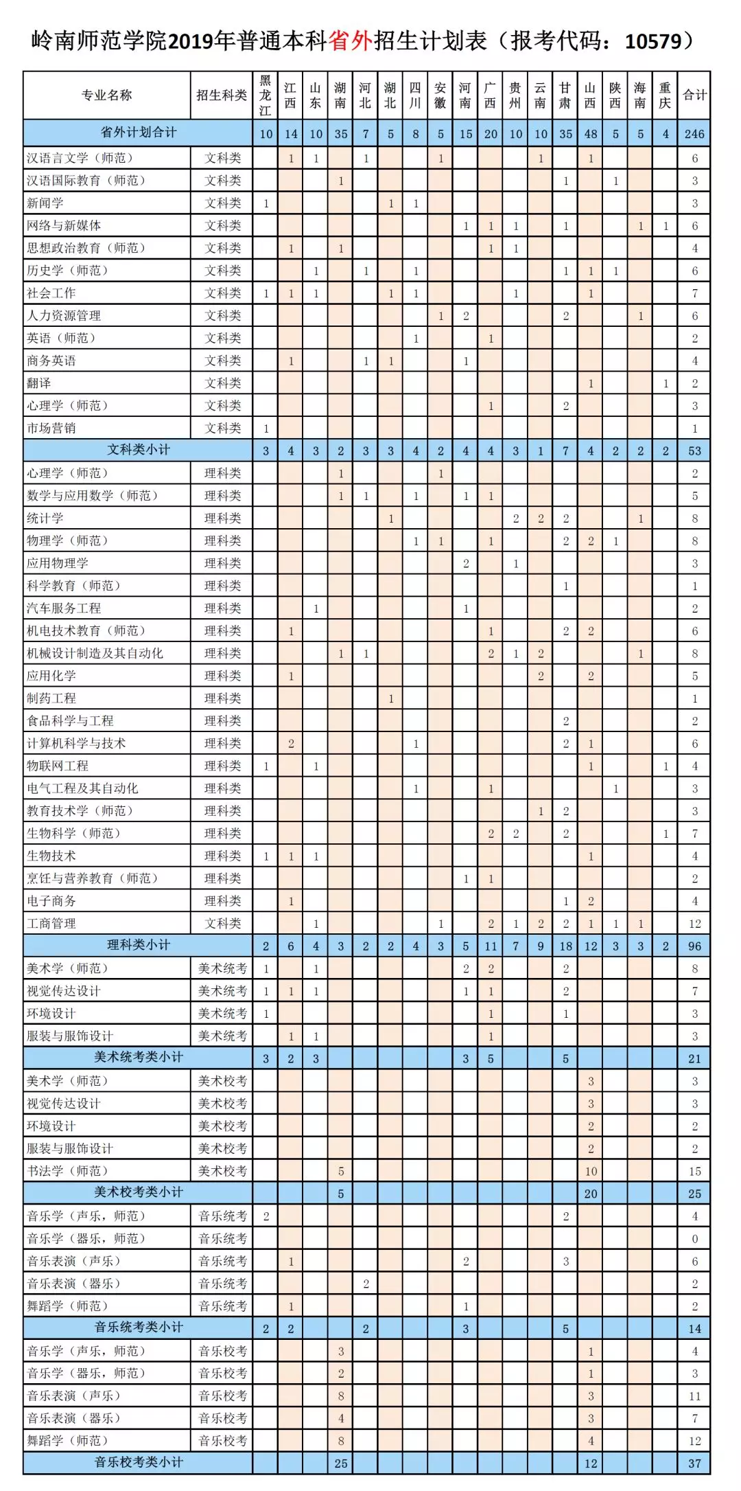 2019年普通本科省外招生计划表