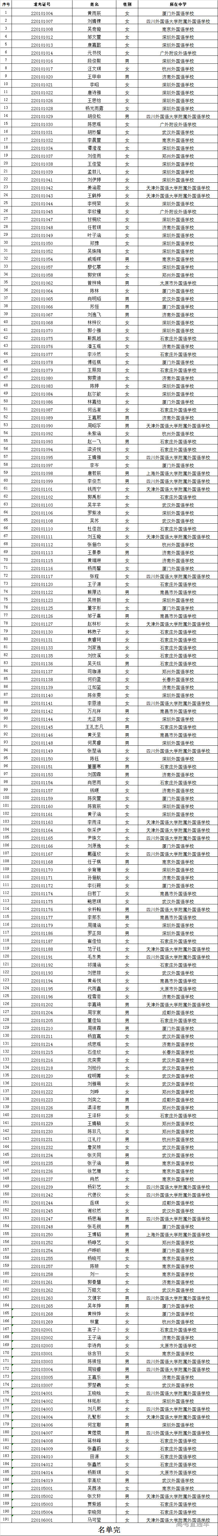 我校于2022年1月13日举行了外语类保送生测试,考生于1月14日22:00起登录武汉大学本科招生服务系统(http://bkzs.whu.edu.cn)可查询本人测试成绩。经研究,从笔试和面试成绩均不低于80分的考生中以总分(笔试和面试成绩之和)高低为序,择优确定以下考生入围我校2022年外语类保送生预备资格,现予公示。公示截止日为2022年1月20日。