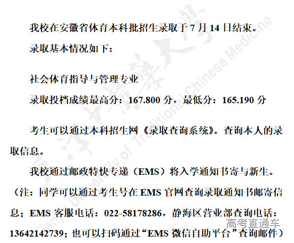 天津中医药大学2022年安徽省体育本科批招生录取结束