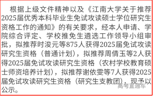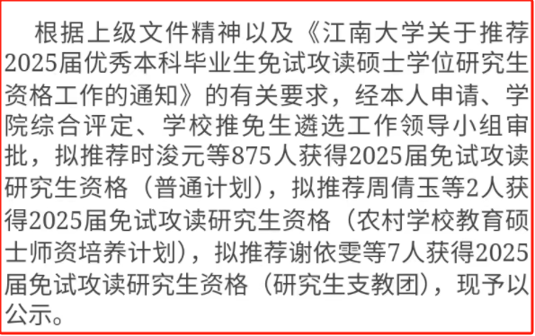 根据 江南大学教务处2025届本科毕业生免试攻读研究生资格名单公示
