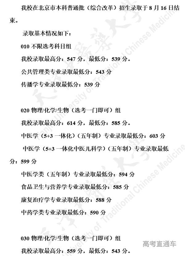 天津中医药大学2020年在北京市本科普通批(综合改革)招生录取结束