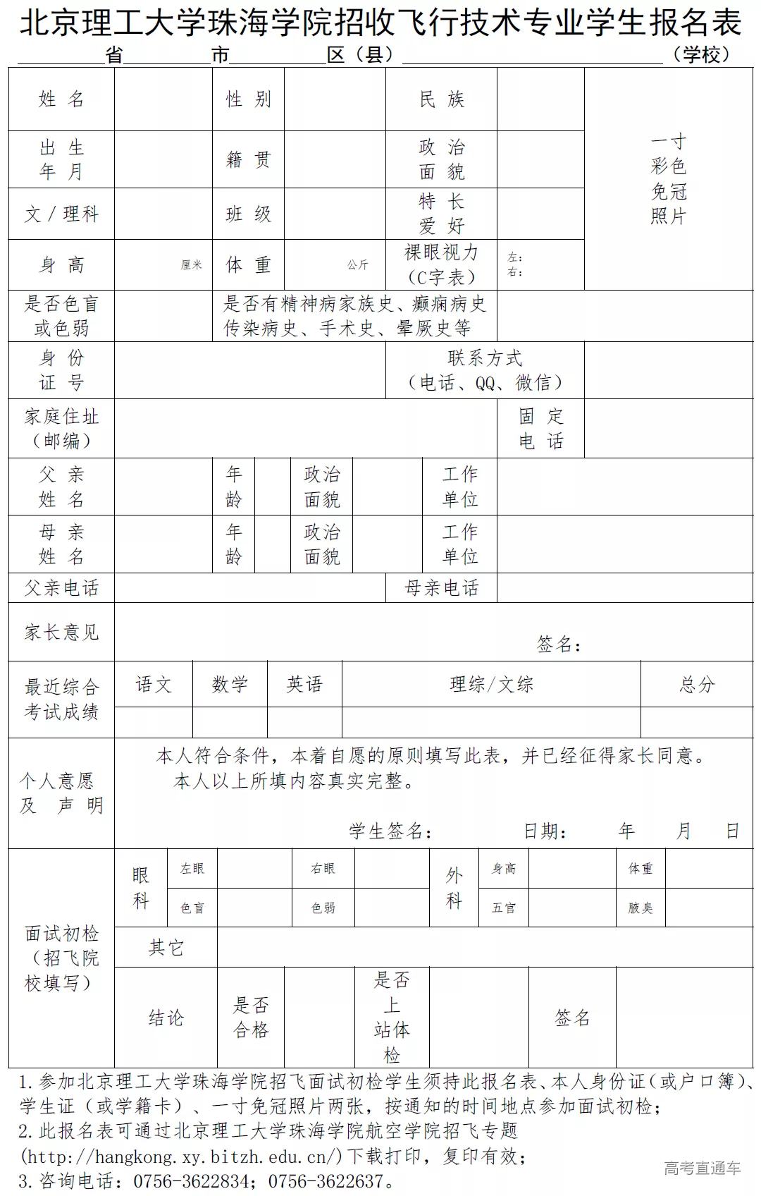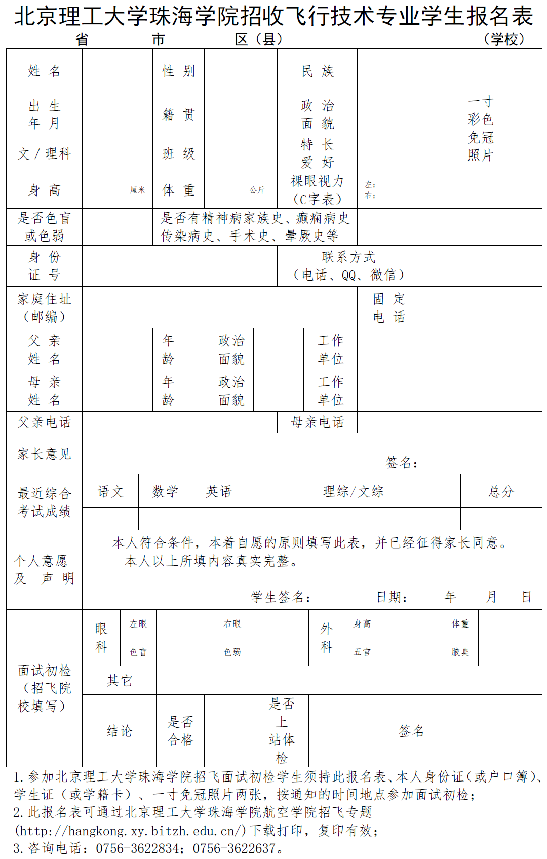 点击下载报名表:北京理工大学珠海学院招收飞行技术专业学生报名表.docx