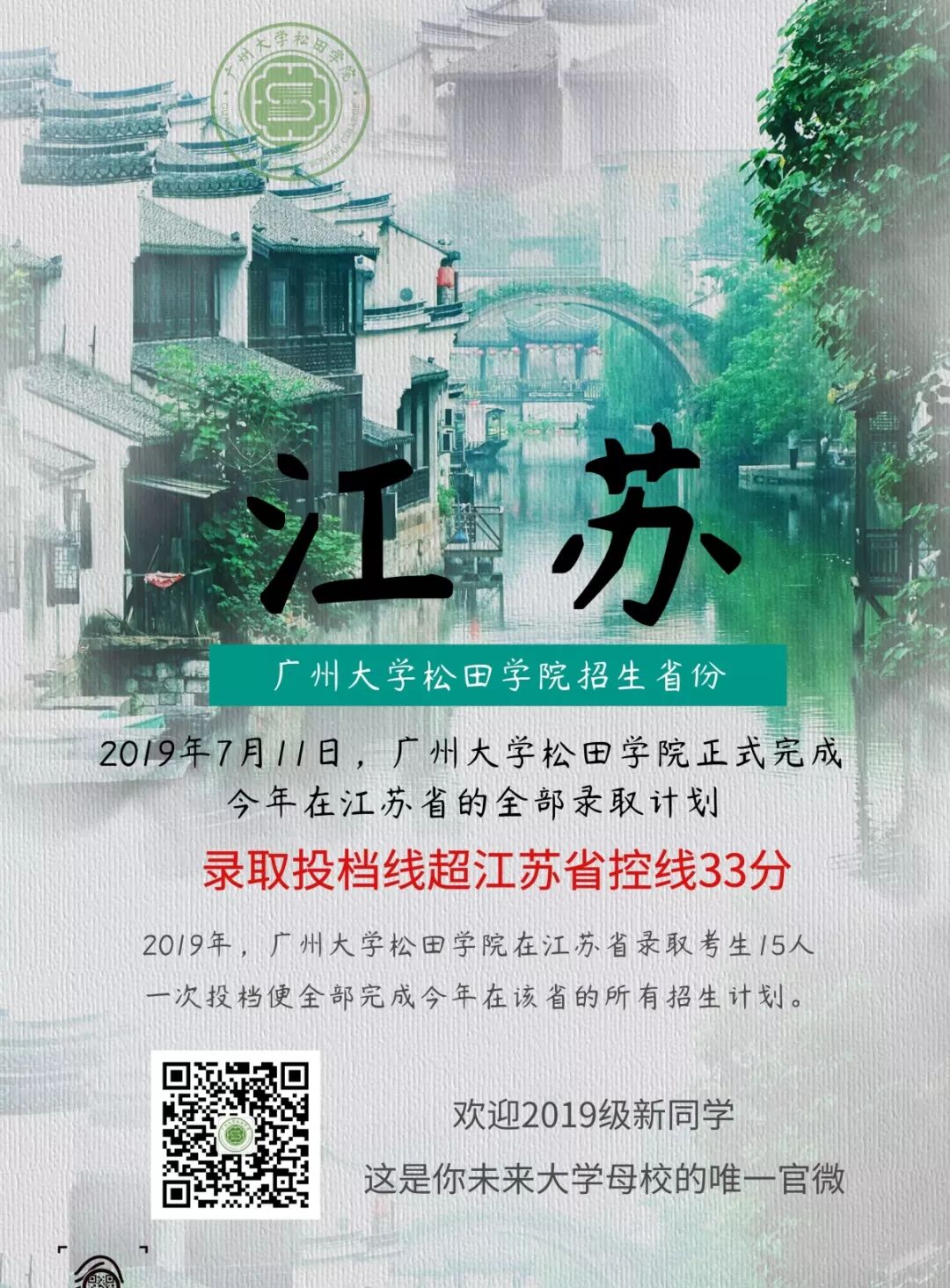 7月11日,随着广州大学松田学院招生办公室完成对江苏省录取数据的提交,广州大学松田学院2019年在该省的录取一次性全部完成,最低投档分高出省控线33分。