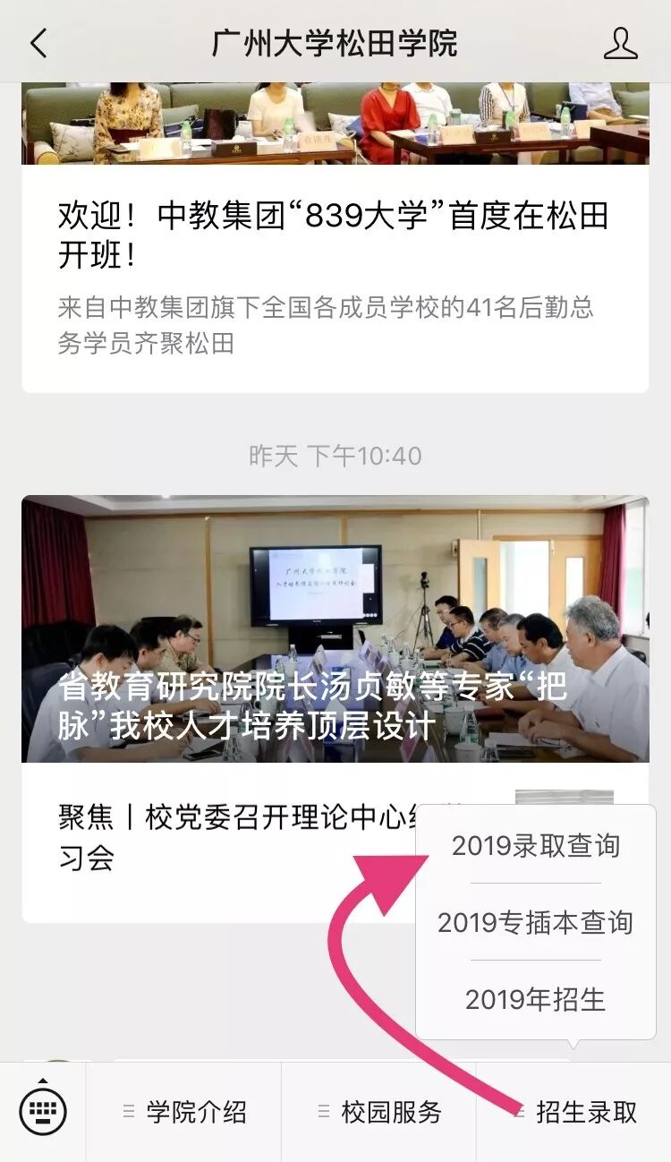 第二步:点击订阅号右下方菜单“招生录取”,进入“2019录取查询”界面