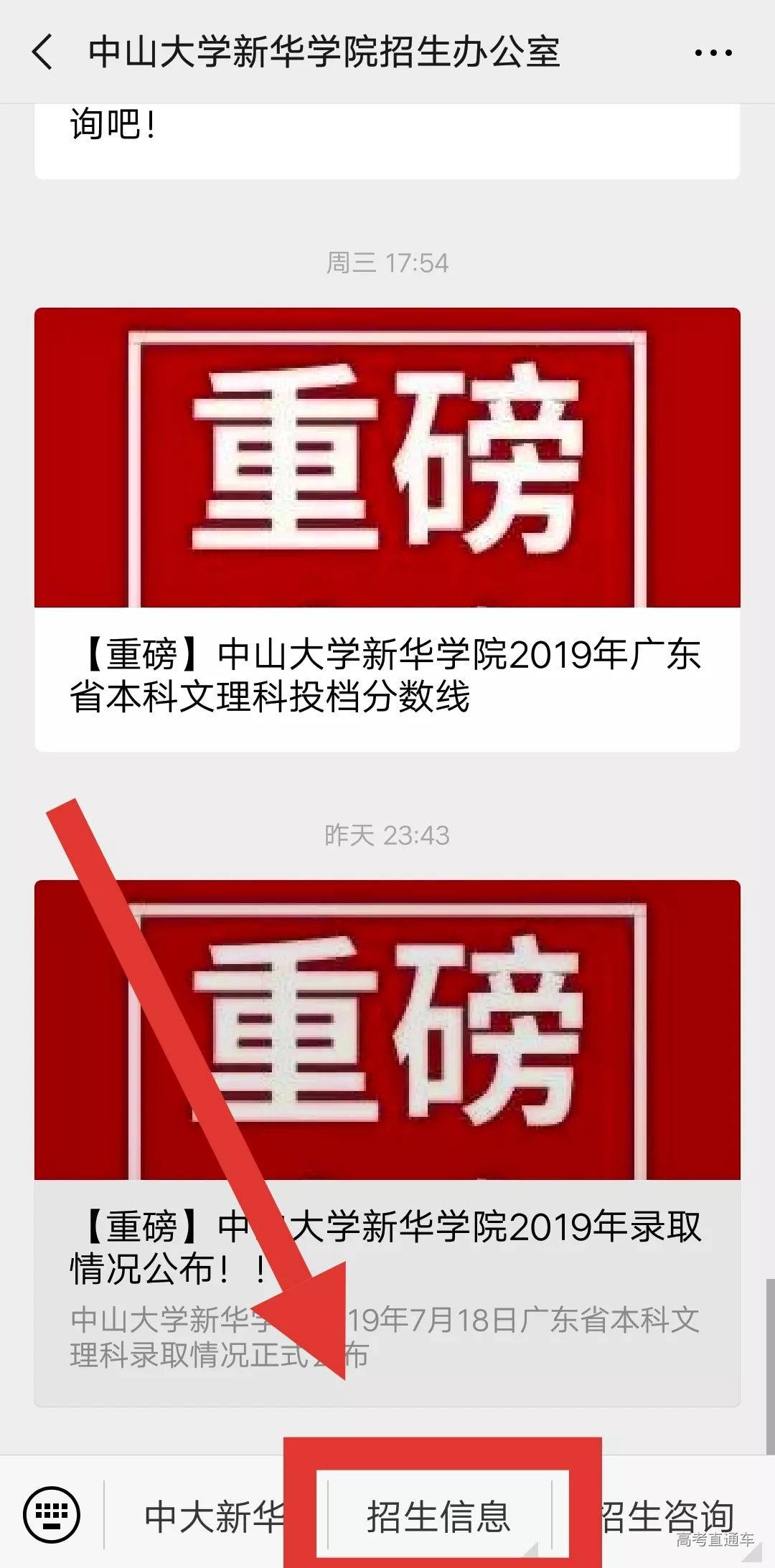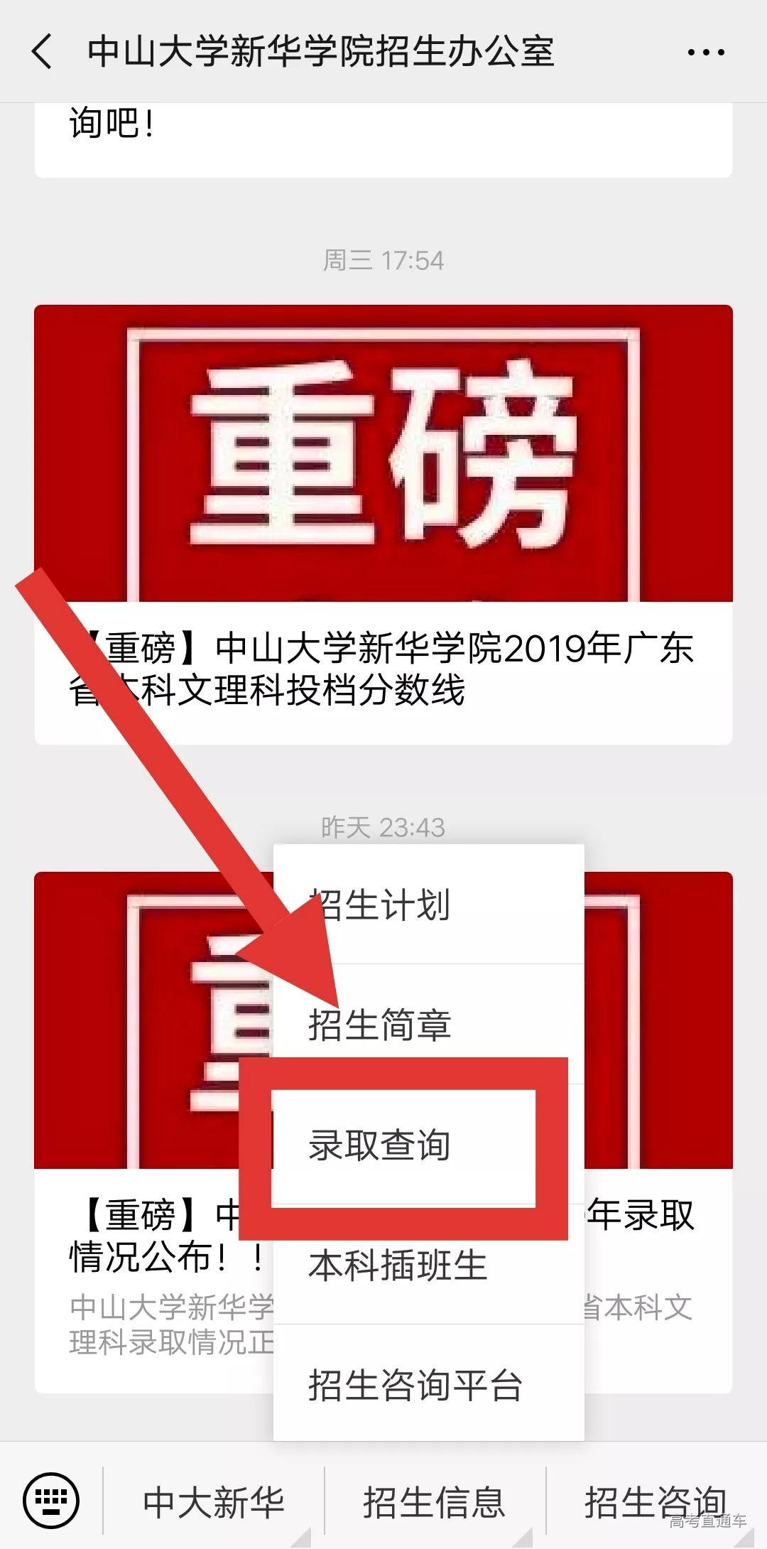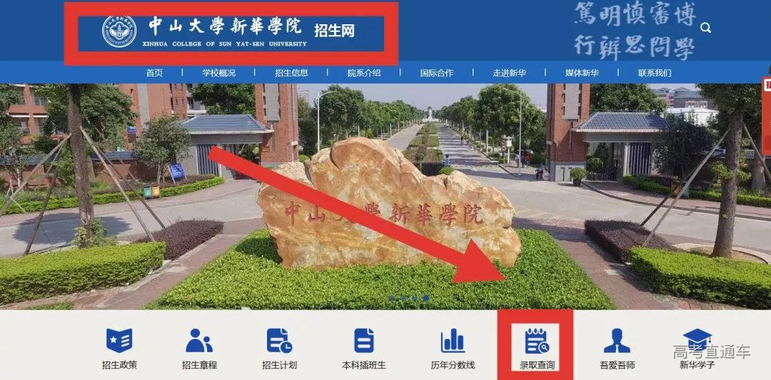 录取结果查询方式 (一)“中山大学新华学院招生办公室”官方微信公众号查询 1.关注并点击进入“中山大学新华学院招生办公室”官方微信公众号。 2.在公众号页面底部点击“招生信息”一栏。 3.点击进入“录取查询”。 4.点击进入后,考生可通过填写身份证号和准考证号进行查询,查询考生的录取结果。 (二)中山大学新华学院招生办公室官方网站查询 1.考生可通过网页查询方式登录中山大学新华学院招生办公室官方网站 ☆链接☆ http://zsb.xhsysu.edu.cn 2.点击进入后,考生可通过填写身份证号和准考证号进行查询,查询考生的录取结果。 其他省份的小伙伴不要着急,我校在海南、湖南、福建、四川、吉林、河南、安徽、云南、山西、陕西、重庆的招生正在火热进行中,请留意中山大学新华学院招生办公室官方微信公众号发送的信息。 我们将会持续在第一时间更新录取信息和结果供大家查阅,敬请关注!