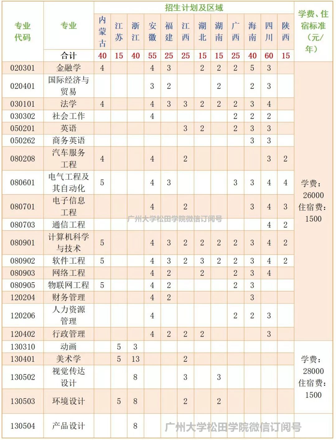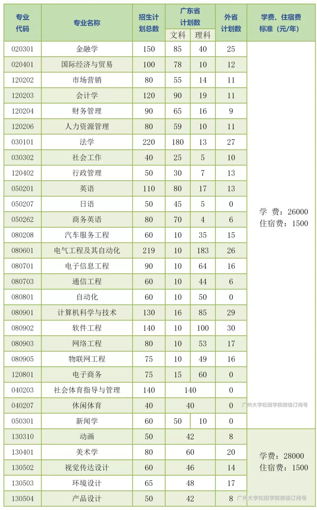 本科独立学院 广州·增城 地铁21号线唯一途经高校 进德修业 勤思知行 院校代码:13657 广州大学松田学校始建于2000年9月,由广州大学和增城市松田实业有限公司合作创建,是广东省最早创办的本科独立学院。 2004年4月经教育部批准,学校实现了由专科向本科教育的跨越。2011年,学校15个申报专业一次性通过了广东省学位委员会组织的学士学位授予权评估。学校为全日制普通本科院校,面向全国统一招生,学制四年,学生成绩合格者由学校颁发“广州大学松田学校”具印的、教育部统一电子注册的本科毕业证书,符合学校学士学位授予规定者,授予相应学士学位。 我校2019年招生总计划4335,其中广东省普高计划2334、外省普高计划370,本科插班生计划1631(已经完成招生录取),设有34个本科专业、52个专业方向,涵盖了文学、法学、经济学、管理学、教育学、工学、艺术学等七大学科门类。在全国13个省、自治区招生。 2019年 招生计划表 2019年 省外招生计划表 2019年夏季普通高考招生章程 第一条 为了保证夏季普通高考招生工作顺利进行,切实维护学校和考生的合法权益,依据《中华人民共和国教育法》和《中华人民共和国高等教育法》等法规、国务院和广东省关于深化考试招生制度改革的实施意见文件精神以及教育部、省招生委员会的有关规定,全面落实《教育部关于进一步推进高校招生信息公开工作的通知》(教学函〔2013〕9号)的要求,结合学校实际情况,特制定本章程。 第二条 学院招生工作遵循“公平竞争、公正选拔、公开程序,德智体美劳全面考核、综合评价、择优录取”的原则,接受纪检监察部门、考生、家长以及社会各界的监督。 第二章 学院概况 第三条 学院全称:广州大学松田学院 第四条 学院国标代码:13657 第五条 学院地址:广州市增城区朱村街朱村大道东432号 邮政编码: 511370 第六条 办学层次:本科 第七条 办学性质:独立学院 第八条 办学类型:全日制 第九条 学院业务主管单位:广东省教育厅 第十条