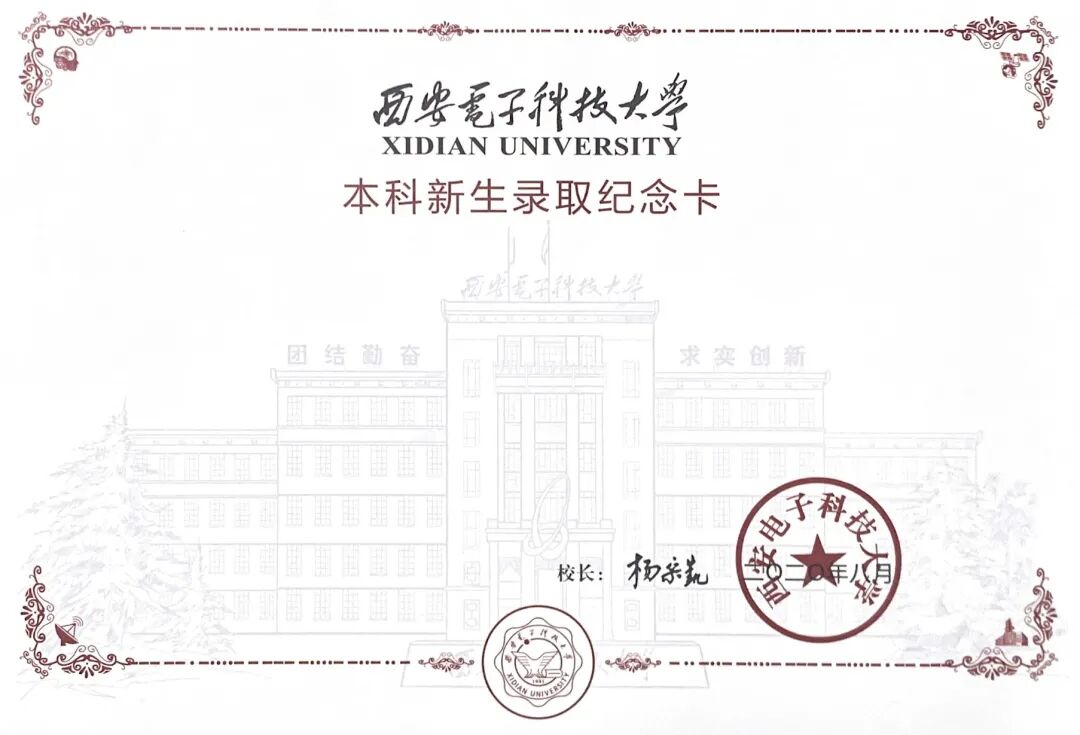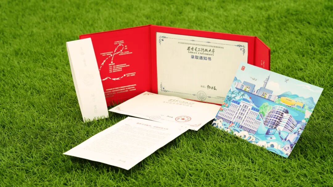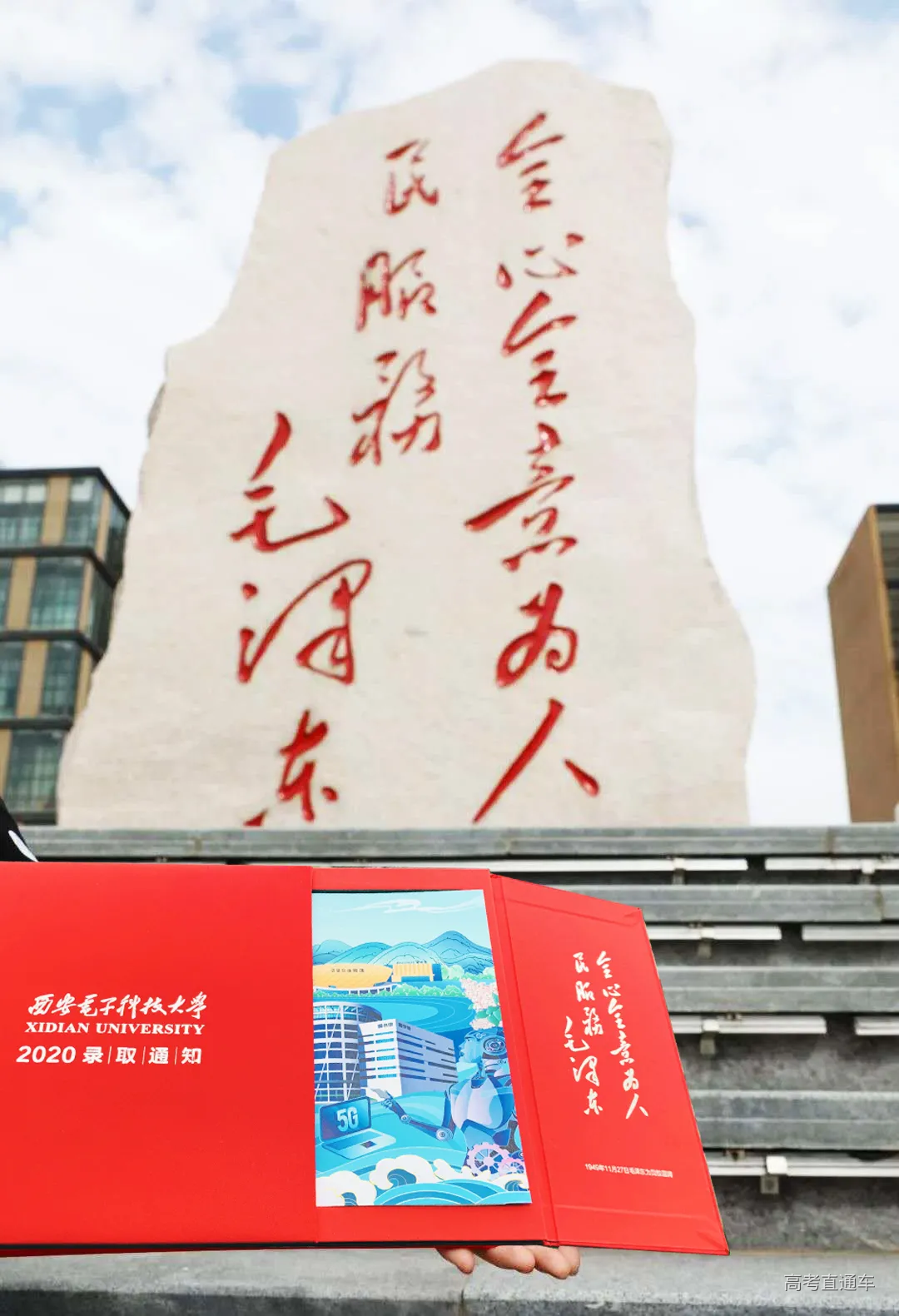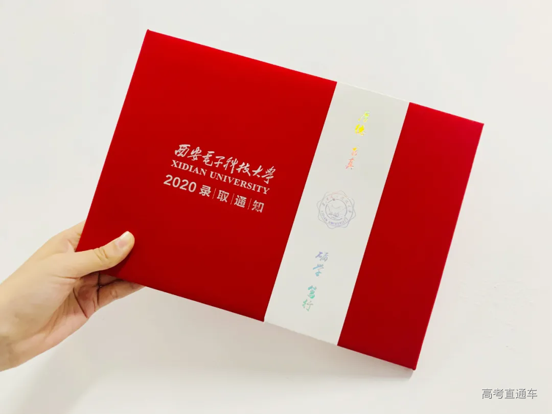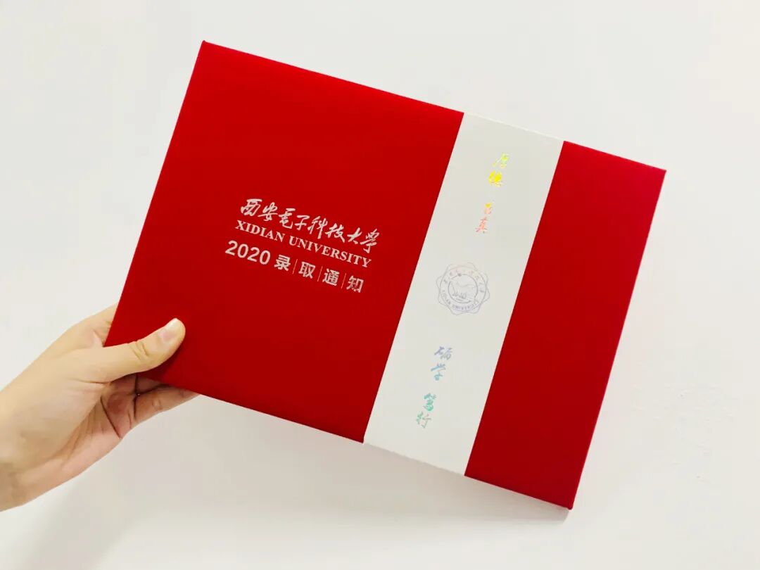长安人间月,渭水浪千叠 岁月如诗贴,青春是无邪 亲爱的学子 2020年西电录取通知书如约而至 请君查收 ▲2020西安电子科技大学录取通知书 你的录取通知书 硬核手绘立体西电印象卡 给力录取通知书 亲切校长祝福寄语 专属新生纪念卡 ... 你的西电录取通知书 远不止于这些! ▲西电学子为2020录取通知书代言 西电录取通知书由绸布封套和装入其中的手绘立体西电”薪火相传“纪念卡、录取通知书正文页、本科新生录取纪念卡、校长寄语组成,在颜色上延续了以往采用的“西电红”,典雅端庄而富历史传承感,具有极大的收藏意义。 手绘立体西电“薪火相传”纪念卡 终南山下,笔转锋回间刻画印象西电 南校北校,浓墨重彩里贯穿楼宇磅礴 各学科logo,不惜笔墨展现办学特色 丁香海棠竹园,一颦一蹙,刻画西电生活 鱼跃龙门,栩栩如生,寄期学子成才报国 ▼ 自己搭配相框 还可作为书桌陈列装饰摆台 给自己和家人多一份美好纪念! 录取通知书正文主页 录取通知书正文页则采用了冷静、严谨的“西电蓝”为主体色彩,西电主楼贯穿整体的设计表现,通讯卫星、雷达、人工智能等设计元素融入其中,以无线电通讯技术中具有代表性的摩斯电码作为花边的装饰元素,无不彰显着我校在通信领域取得的成绩和鲜明的电子信息特色。 ▲以电子信息类被录取考生为例 本科新生录取纪念卡 今年,我们仍为新生们准备了“本科新生录取纪念卡”,以西电标准红色释放的热情、拼搏进取精神作为入学纪念卡的主色,铭记西电红色基因。 校长寄语 杨宗凯校长随录取通知书附信一封,回忆西电荣光往事、细数西电今朝锐举、展望西电百年未来,寄语2020级新生“把准青春航向,奋楫时代大潮”。 初入西电 首先,祝贺同学们以优异的成绩来到西电 在这里, 你们即将步入恢弘的大学殿堂 翻开人生新的篇章 西电北校区主楼 是西安高校中最具代表性的苏式建筑 她既承载学校历史和记忆 也是所有西电人心目中精神家园的共同寄托 ▲西安电子科技大学北校区主楼 “全心全意为人民服务”主雕塑 1949年毛主席亲笔题词 石碑屹立,精神传承 厚德、求真、砺学、笃行 2020年西电人初心不改 立德树人、血脉延续 ▲西安电子科技大学南校区 西电图书馆 集万千知识与技术革新于一体 在这里,你能智慧阅读,感知科技 在这里,你将徜徉书海,穿越古今 ▲西安电子科技大学南校区图书馆 西电观光塔 现代与科技紧紧相拥 直指云霄,赫然矗立 数时光流沙,身临西电成长 与时钟比肩,俯瞰变幻风云 在这里,校园全景都尽收眼底 ▲西安电子科技大学南校区观光塔 西电远望谷体育馆 在这里 你们将挥洒汗水 奋力奔跑,绽放青春 ▲西安电子科技大学南校区远望谷体育馆 奔你而来的录取通知书 各位准西电er们 你的专属录取通知书 即将奔你而来 我们的工作人员们 正在为大家封装、邮寄录取通知书哦~ ▲等待邮寄的录取通知书们 与录取通知书4份材料一同邮寄的 ⚠️ 小召提醒各位家长和考生: 学校官方邮寄仅此一次,并无其他物品需要签收! 录取通知书发放动态 (截止8月18日09:00) 我们在西电等你来! 2020这一年注定是一个不平凡的一年 在新冠疫情的挑战下 各位准西电人 也闯过了一个不平凡的高考时光 经此一役,方知韶华不负 别来无恙,更念只争朝夕 愿西电, 是你们的可贵如常 愿你们在西电, 芳华永驻,青春无悔 9月,我们在西电等你来!